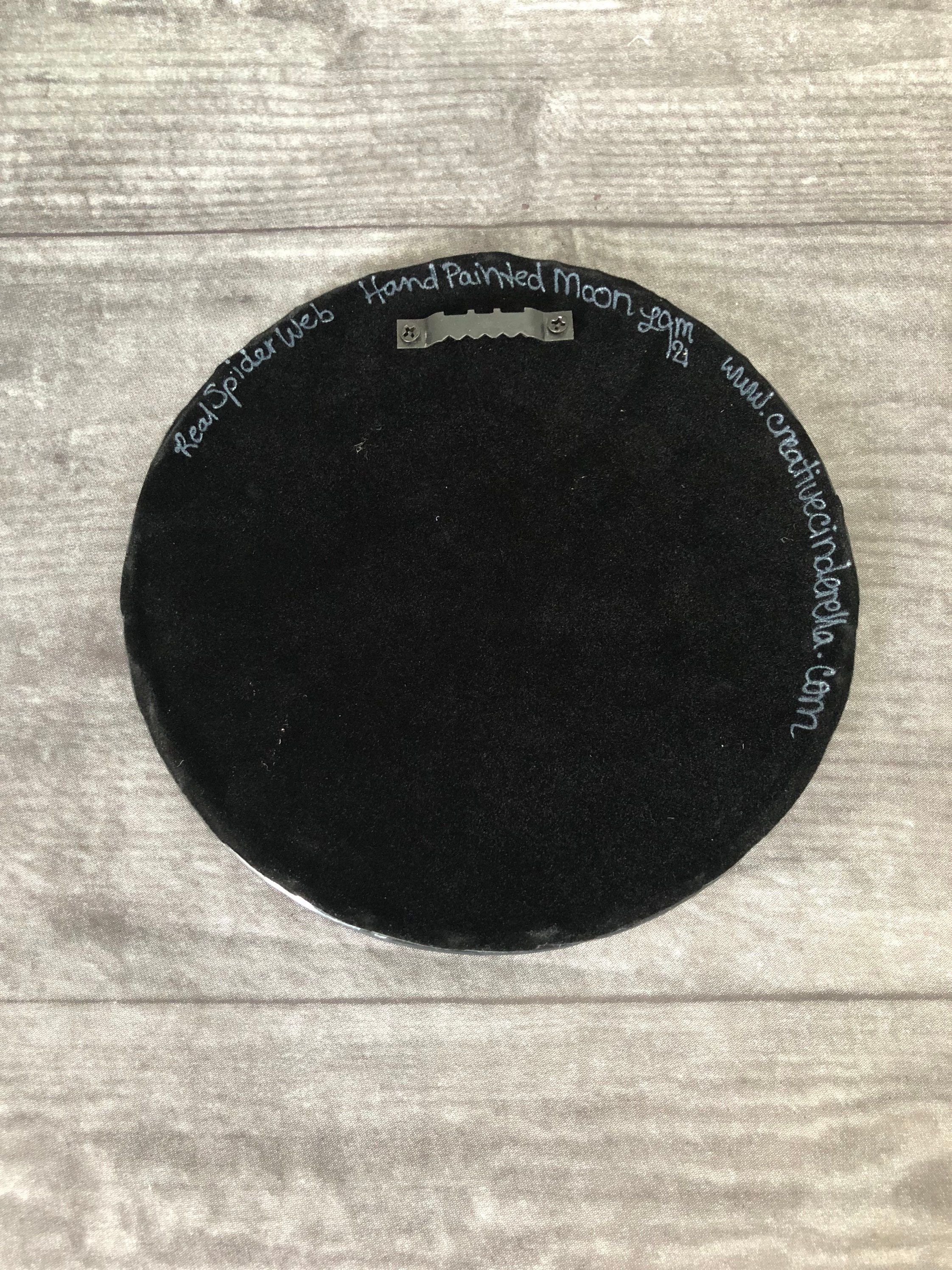 This crescent moon along with its craters, is hand painted with acrylic paint. It’s been sealed onto a painted black wooden plaque. It measures 7” Round and is 1/4” inches high.