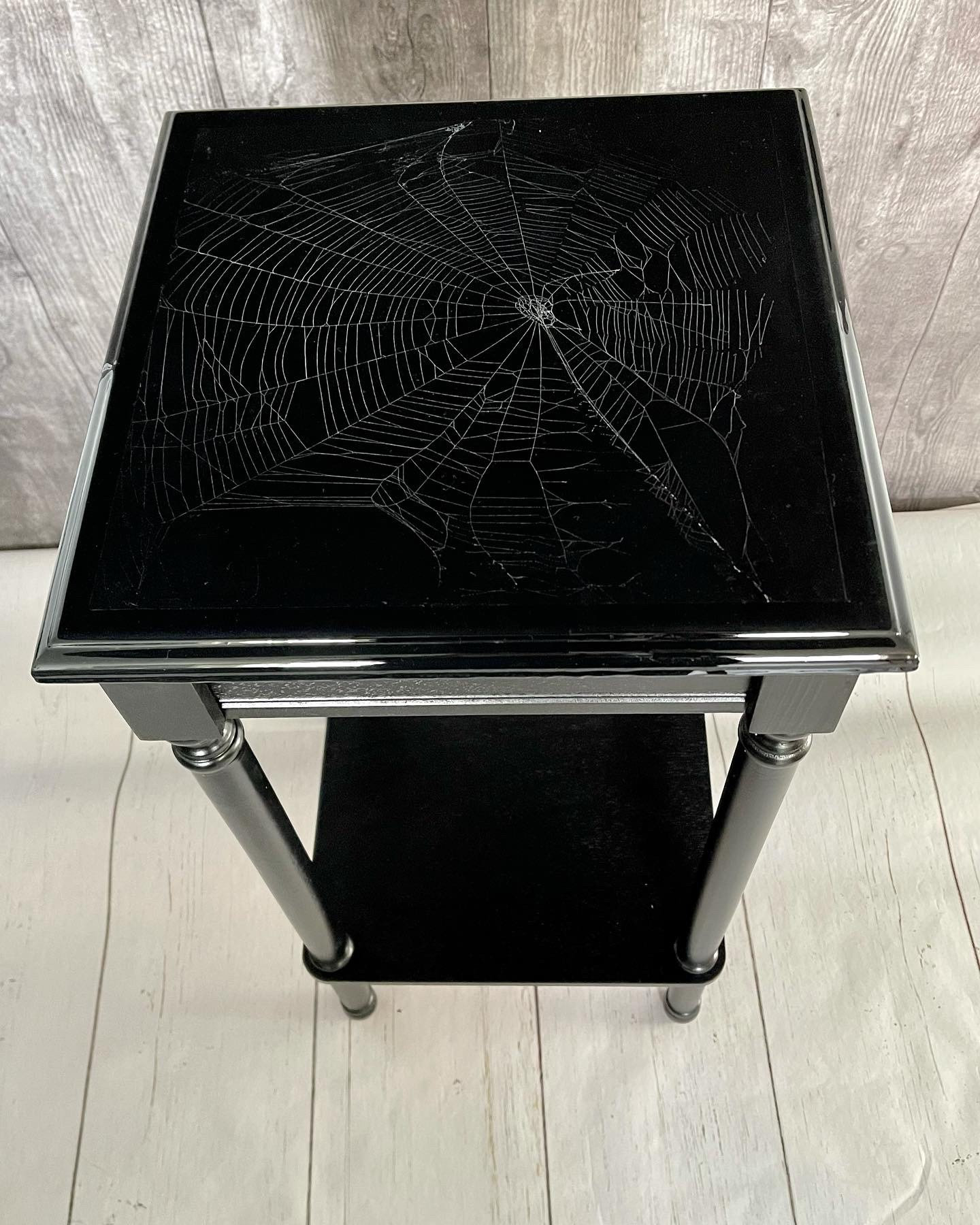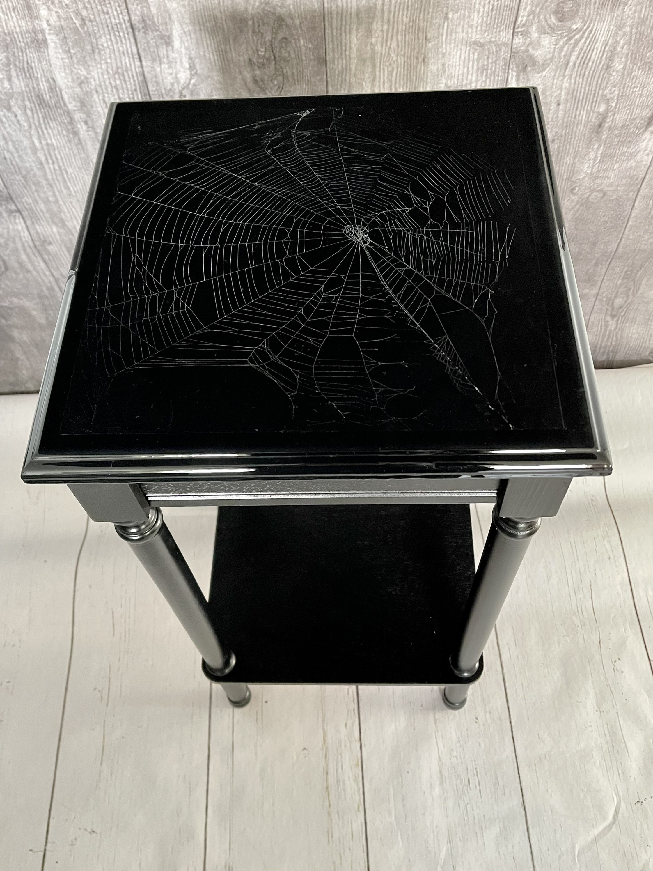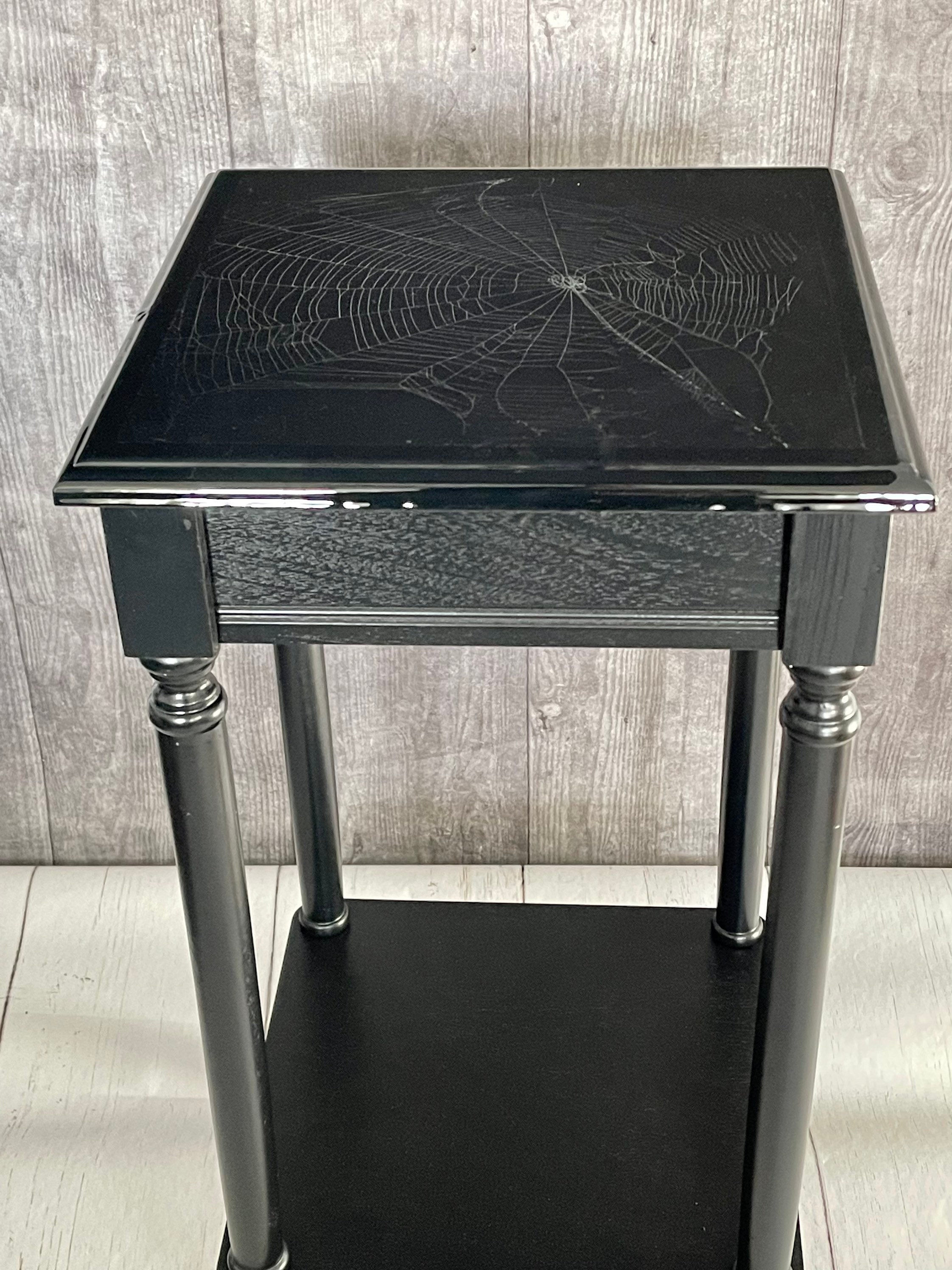 The web has been set and sealed onto a black accent table. The table measures 14” square and is 28”inches high. The table has been sealed with a UV protected Eco friendly resin to preserve and enhance its natural beauty.