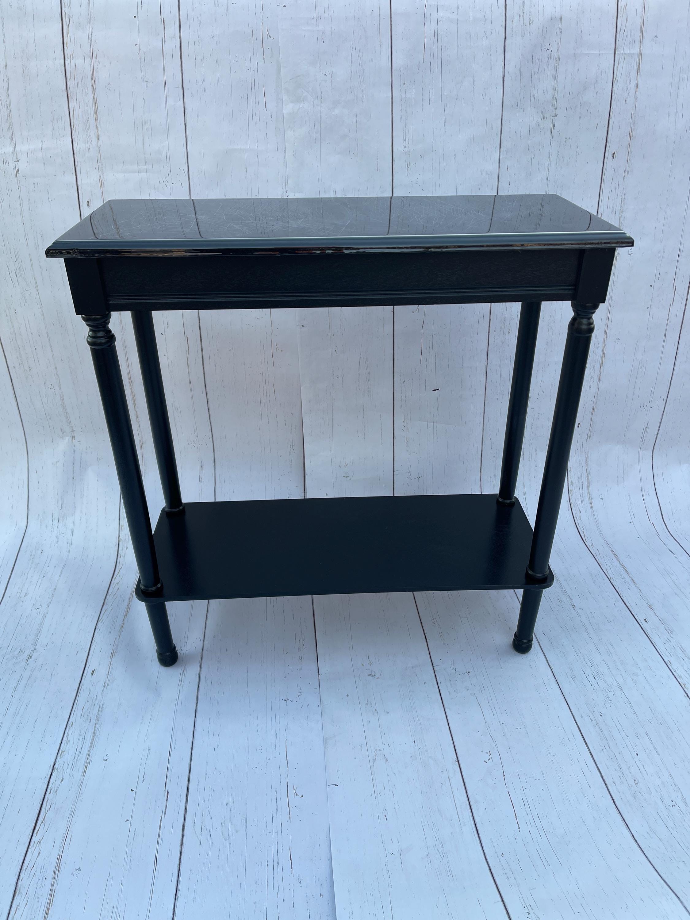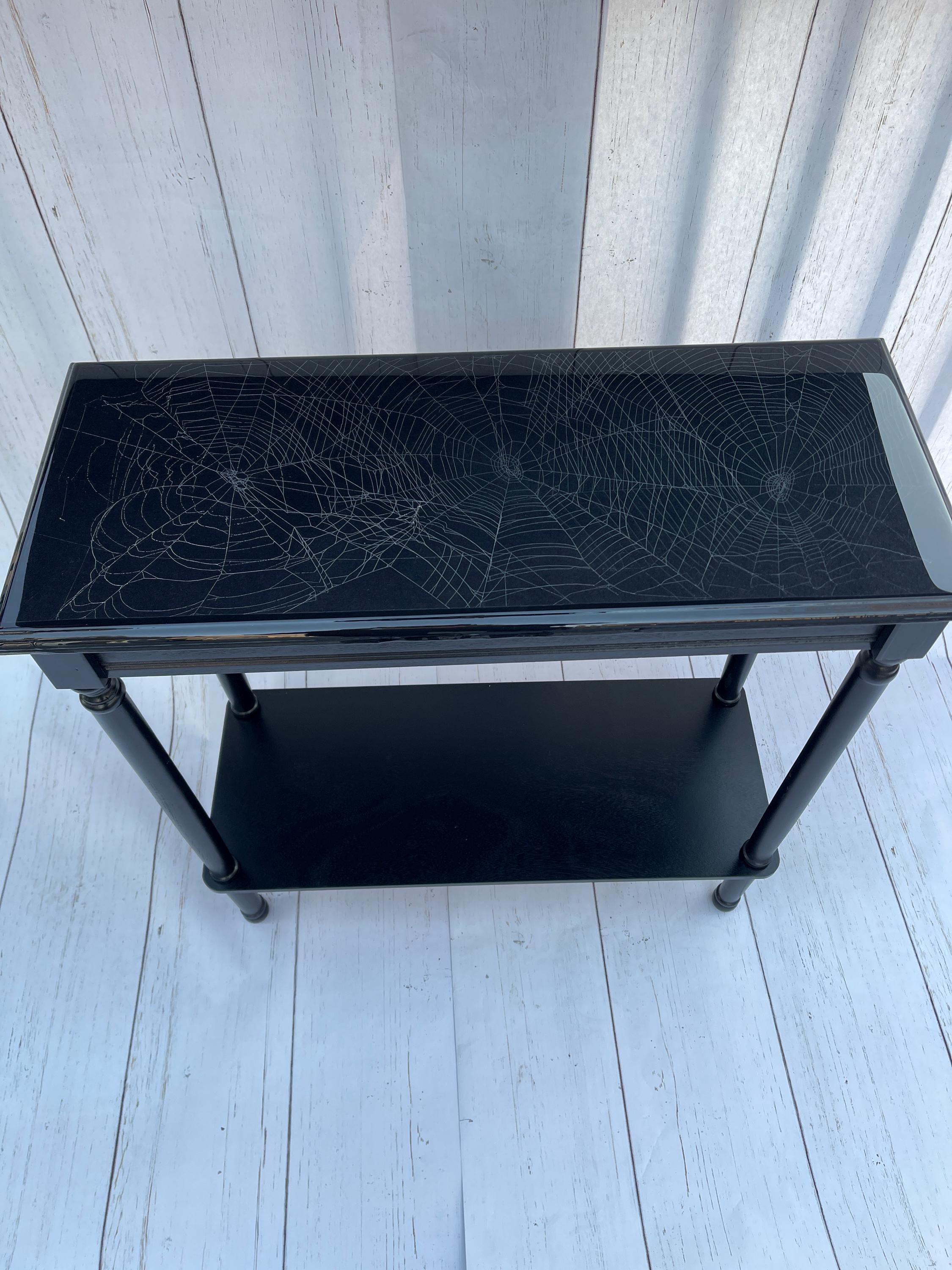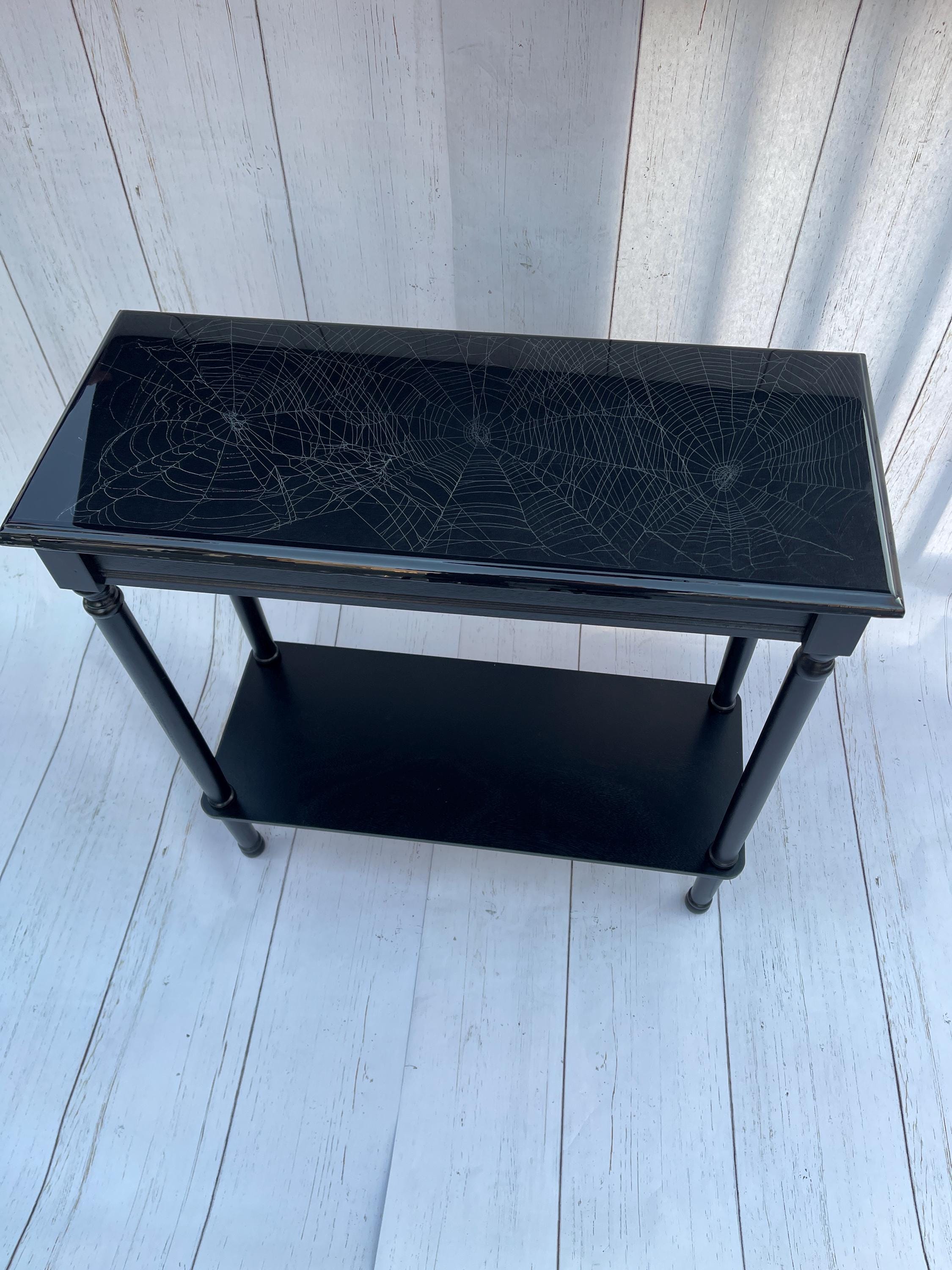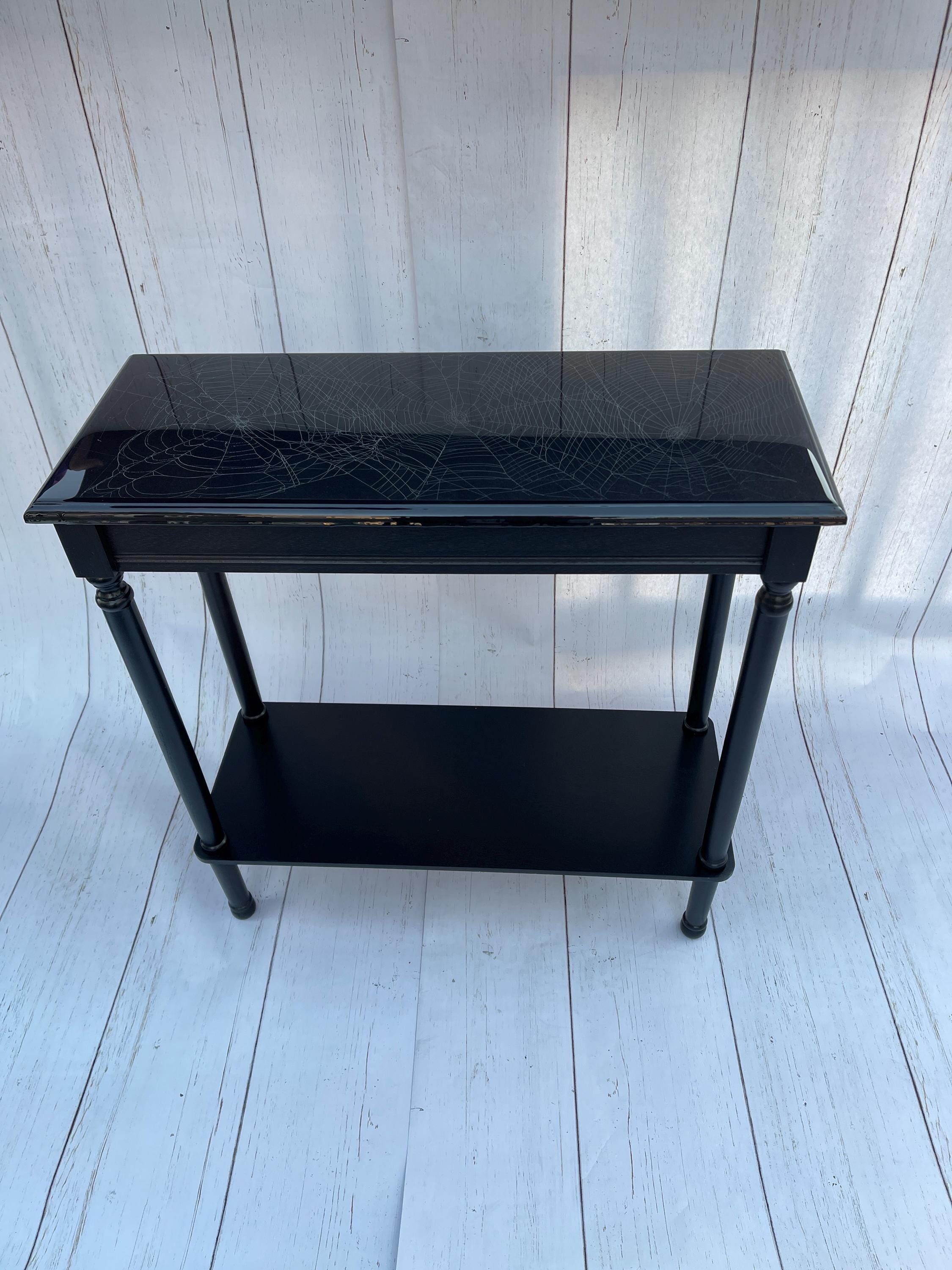 This table has a preserved Spider Webs set and sealed on top of this black painted console table.