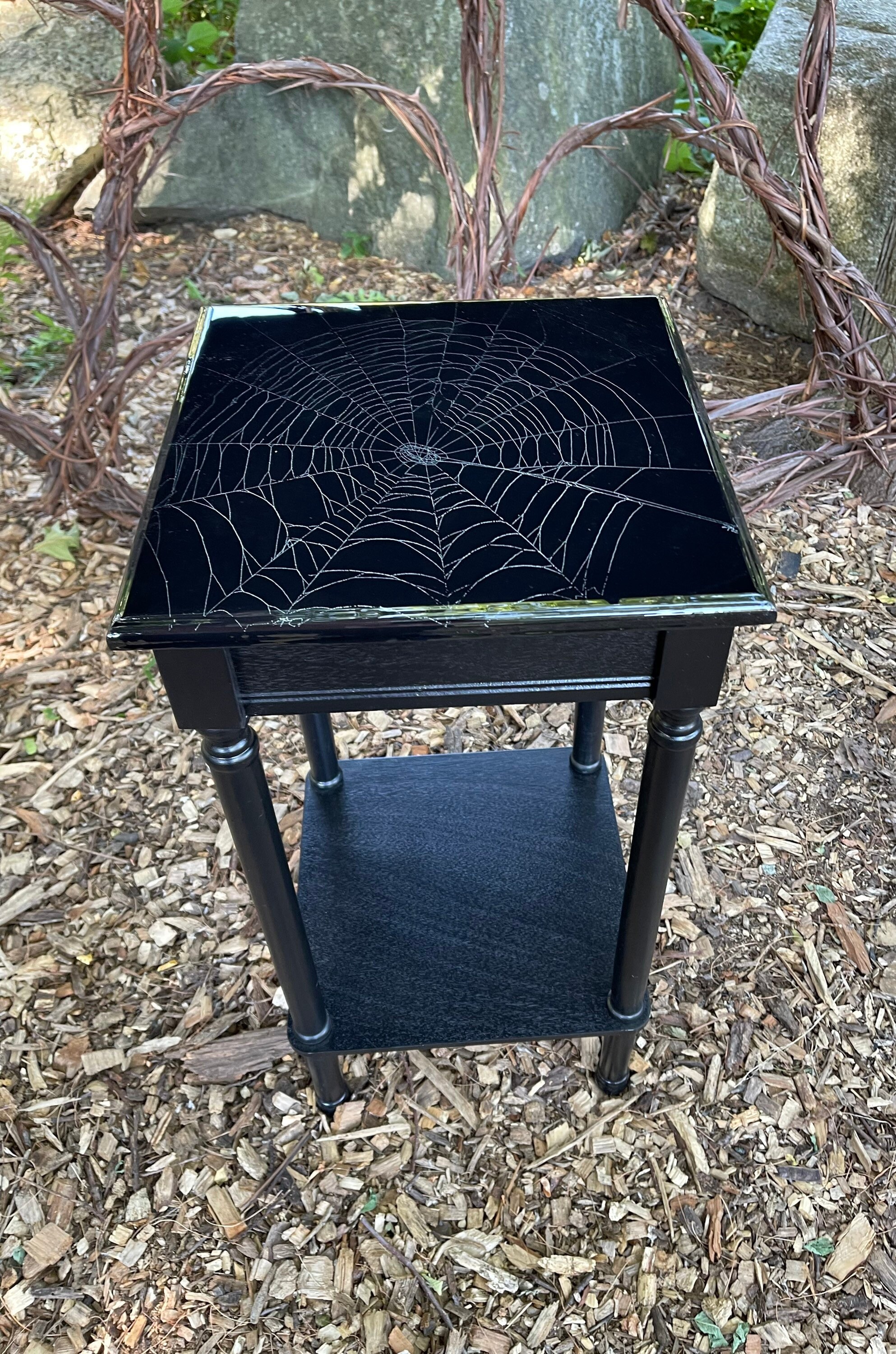The web has been set and sealed onto a black accent table. The table measures 14” square and is 28”inches high. The table has been sealed with a UV protected Eco friendly resin to preserve and enhance its natural beauty.