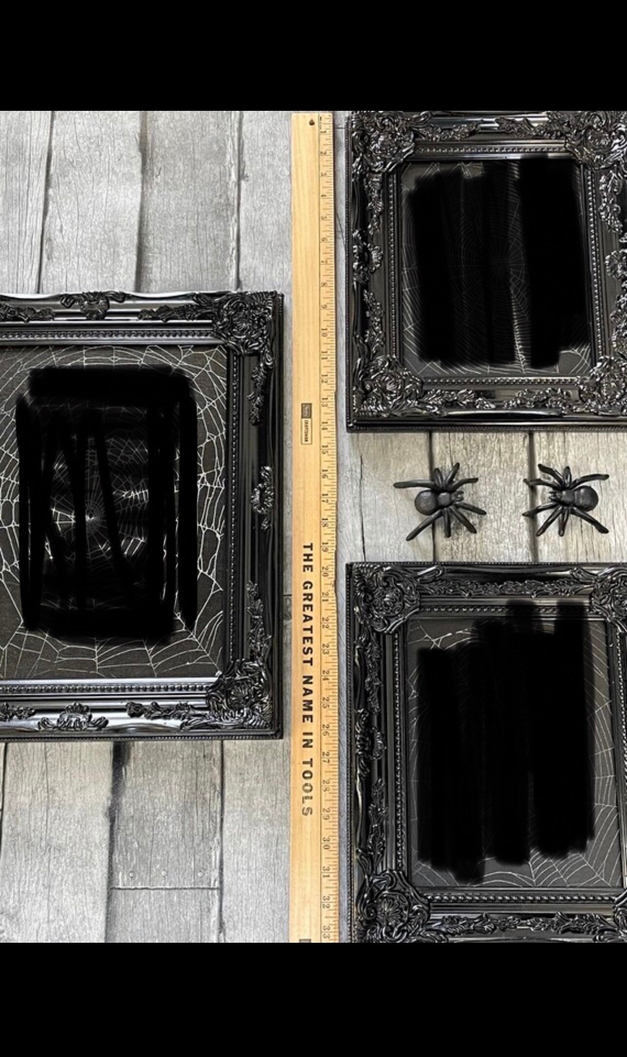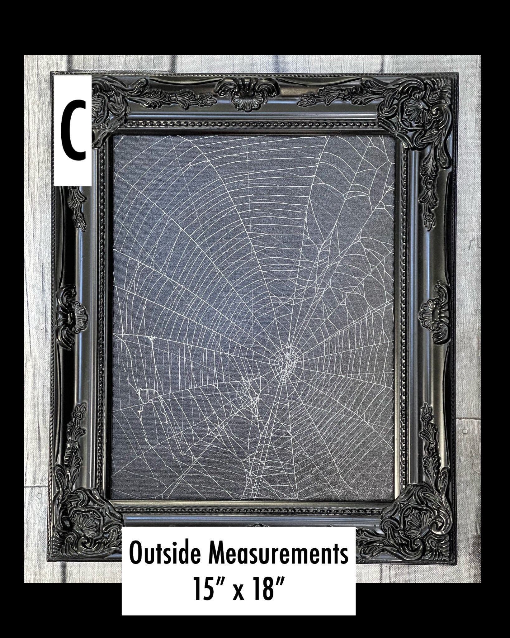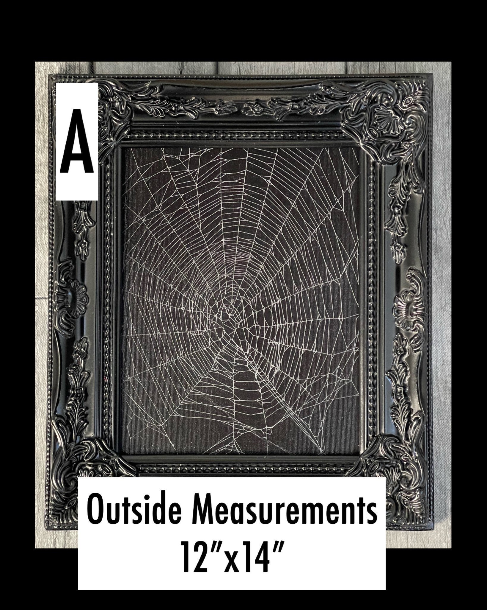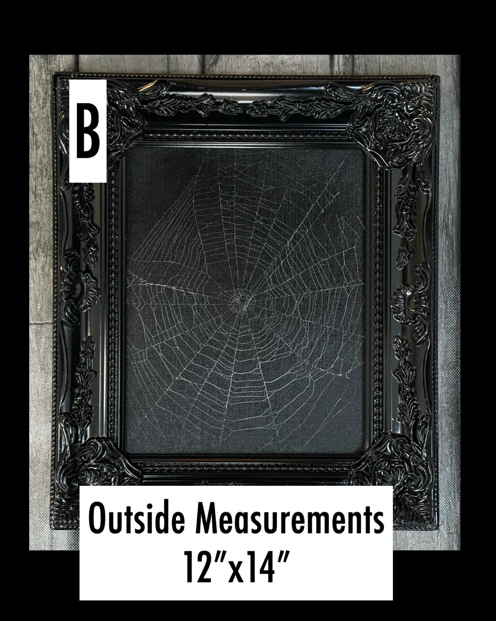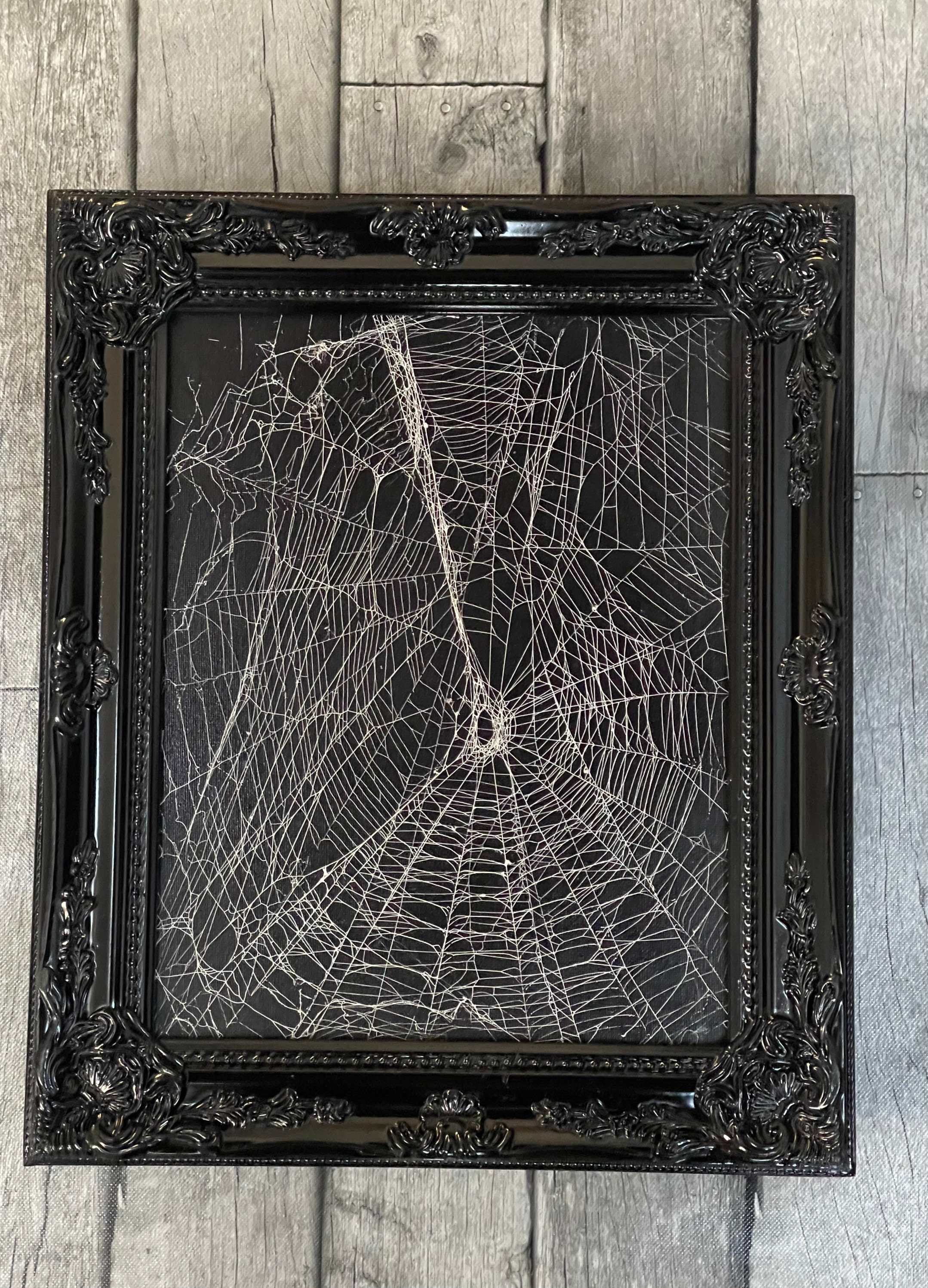 This is a Real Spider Web, Preserved onto a black canvas board and placed in a painted Black, Large, Ornate Victorian frames.