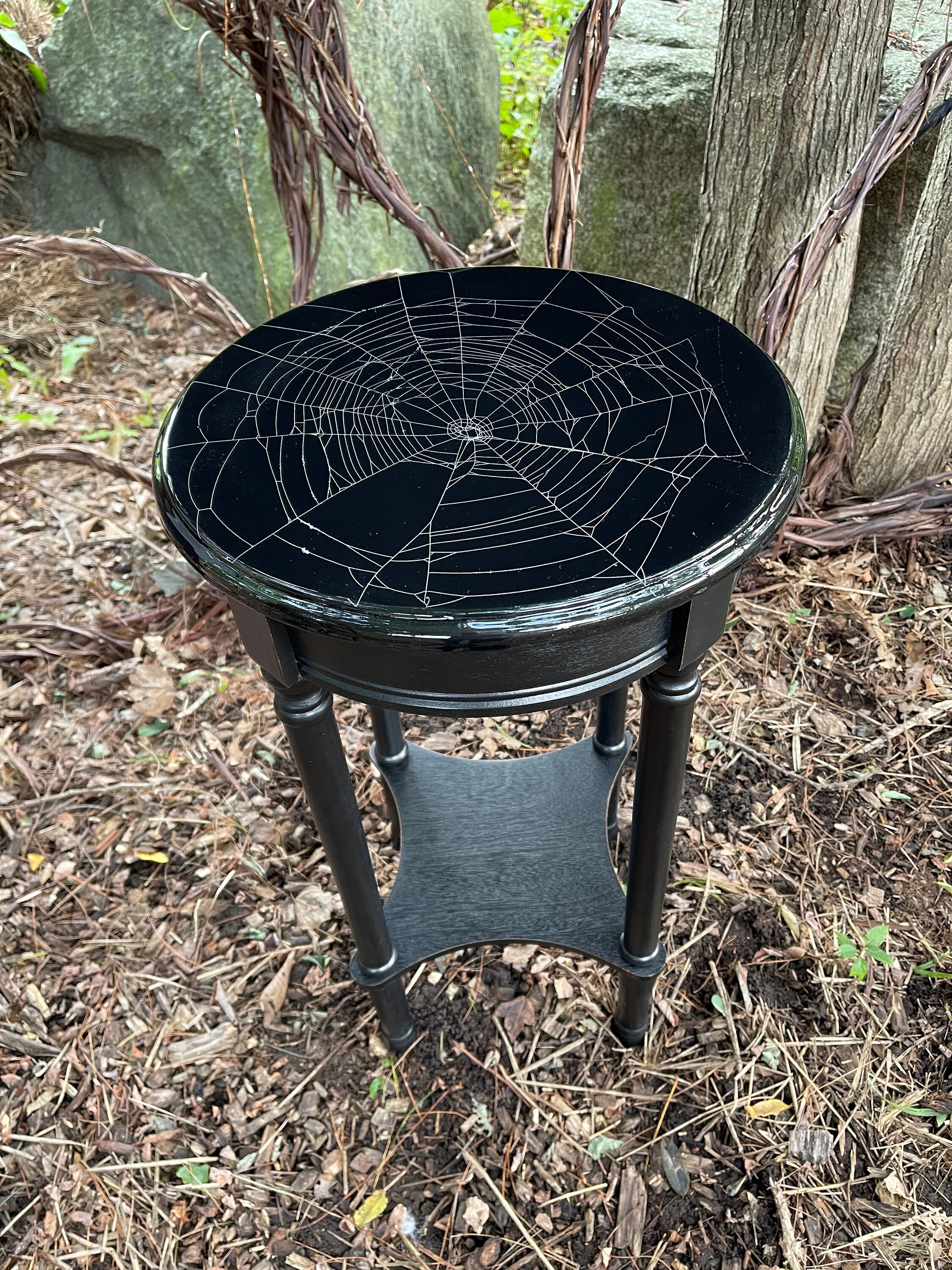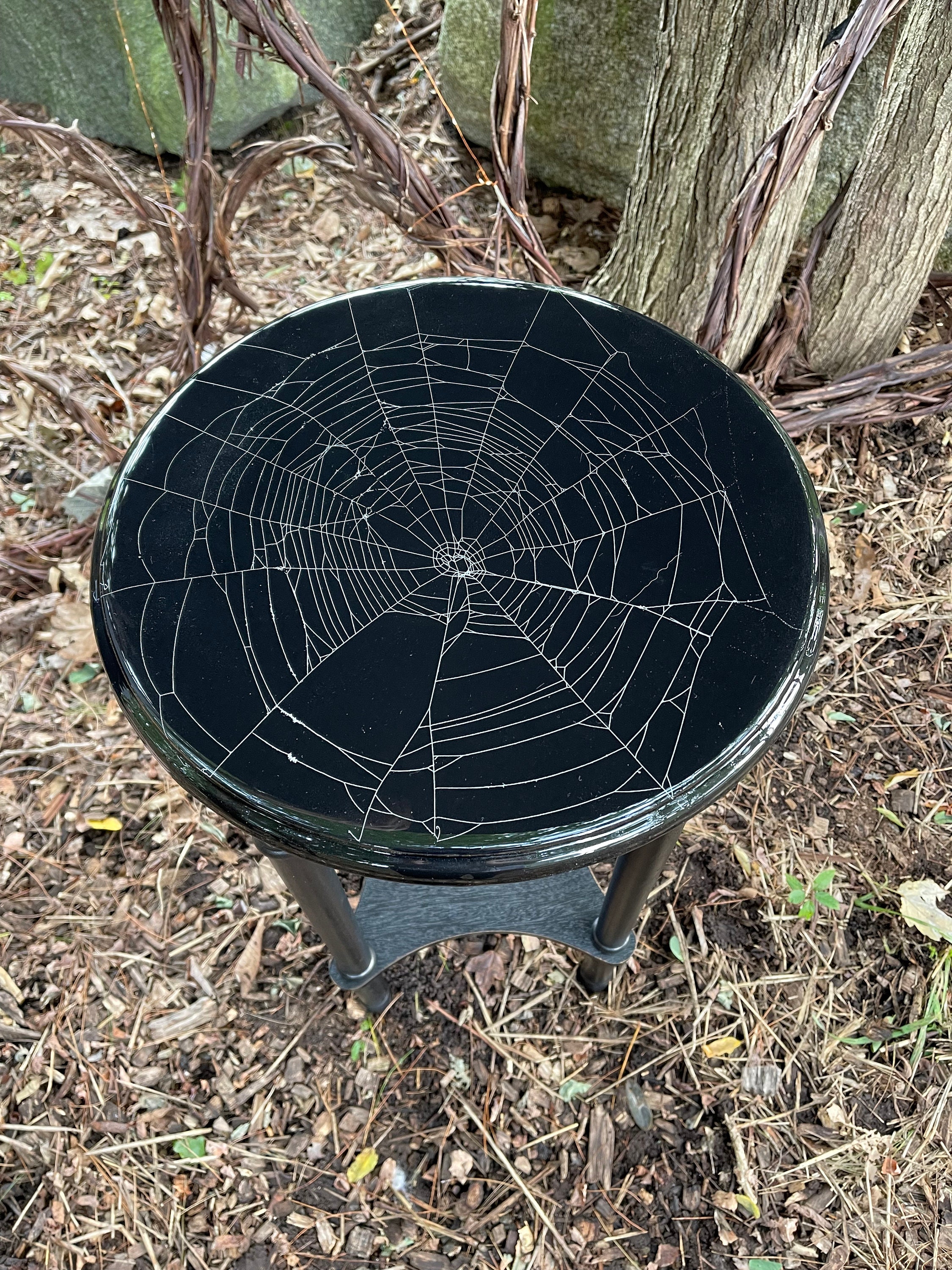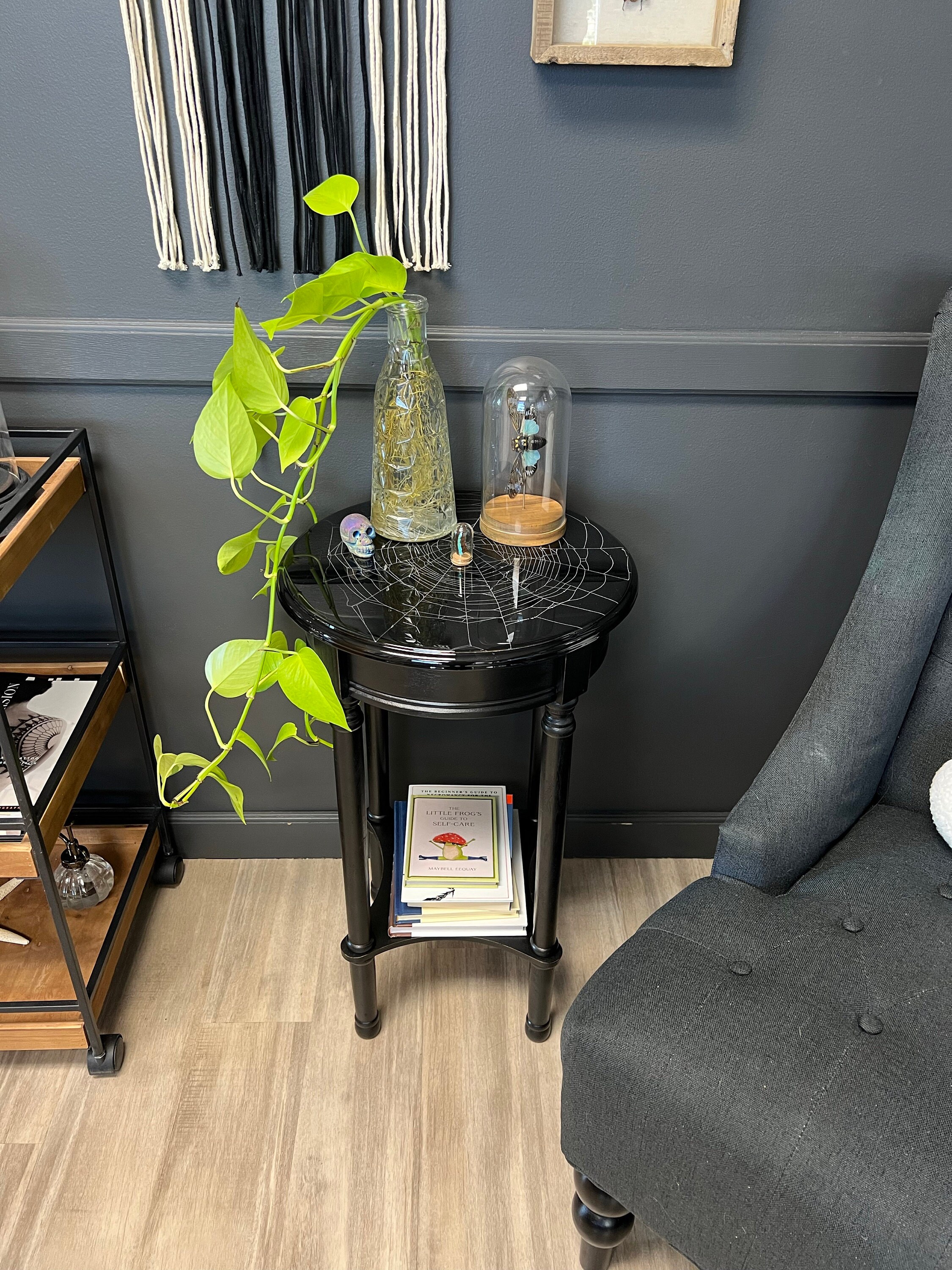 This is a Genuine Spider Web Preserved on Black paper. The web has been set and sealed onto a Round black accent table. The round top measures 15 1/2” wide and is 26” inches high. The table has been sealed with a UV protected Eco friendly resin to preserve and enhance its natural beauty.