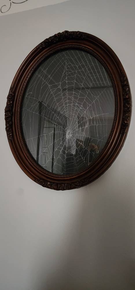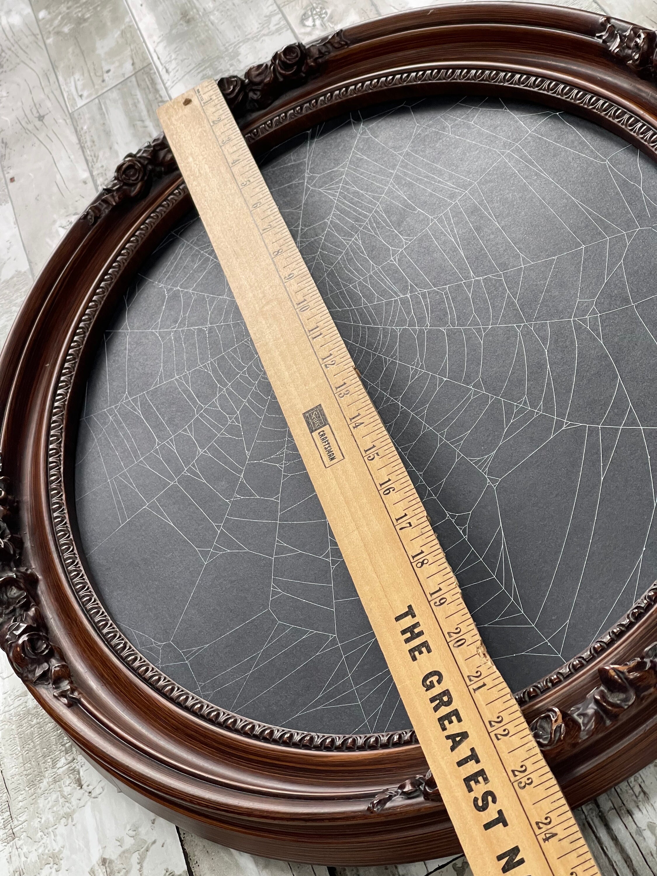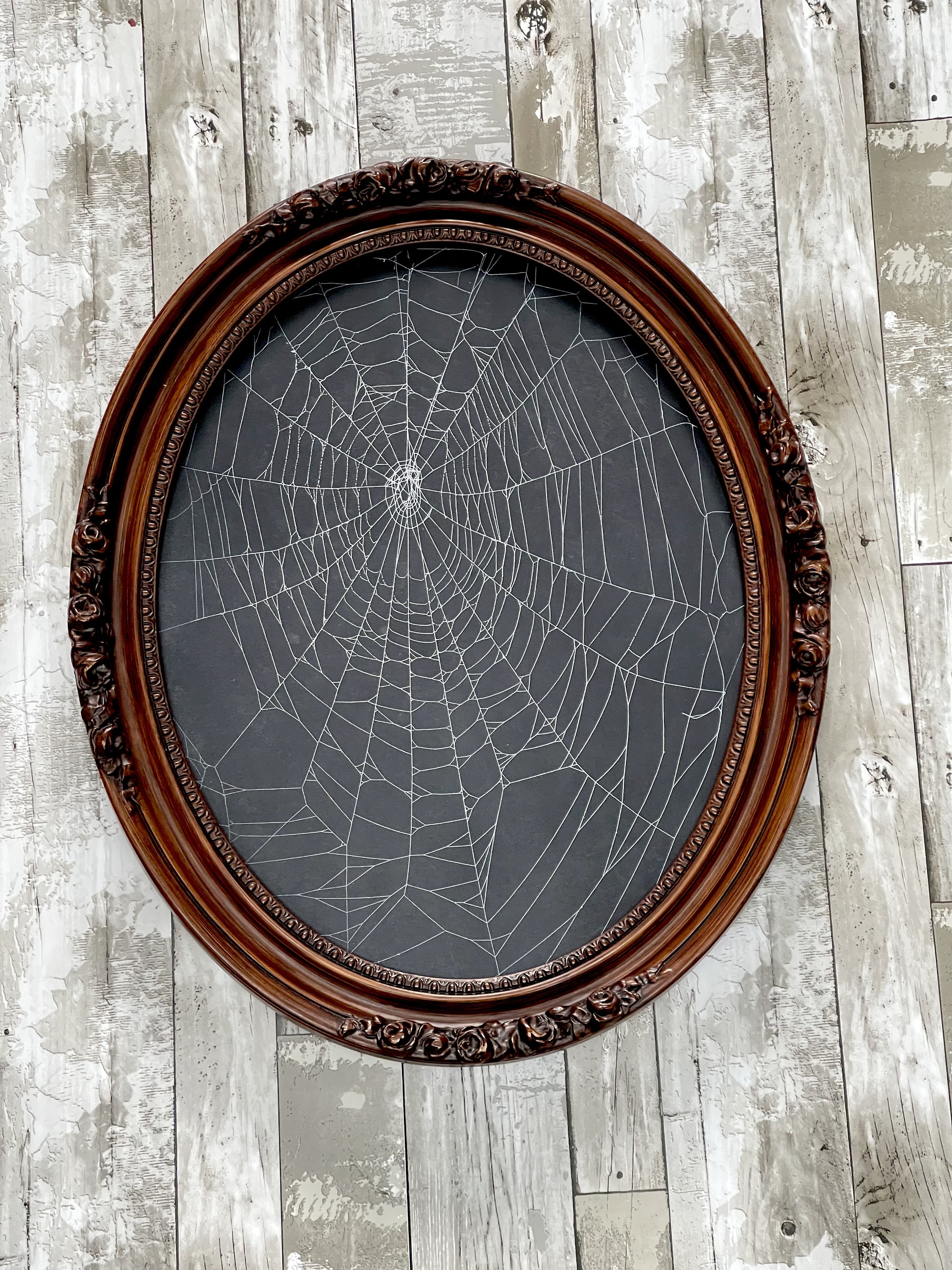 This is a Spider Web, Preserved onto a black canvas board and placed in a faux wood, vintage (up-cycled) Large Ornate Victorian frame.