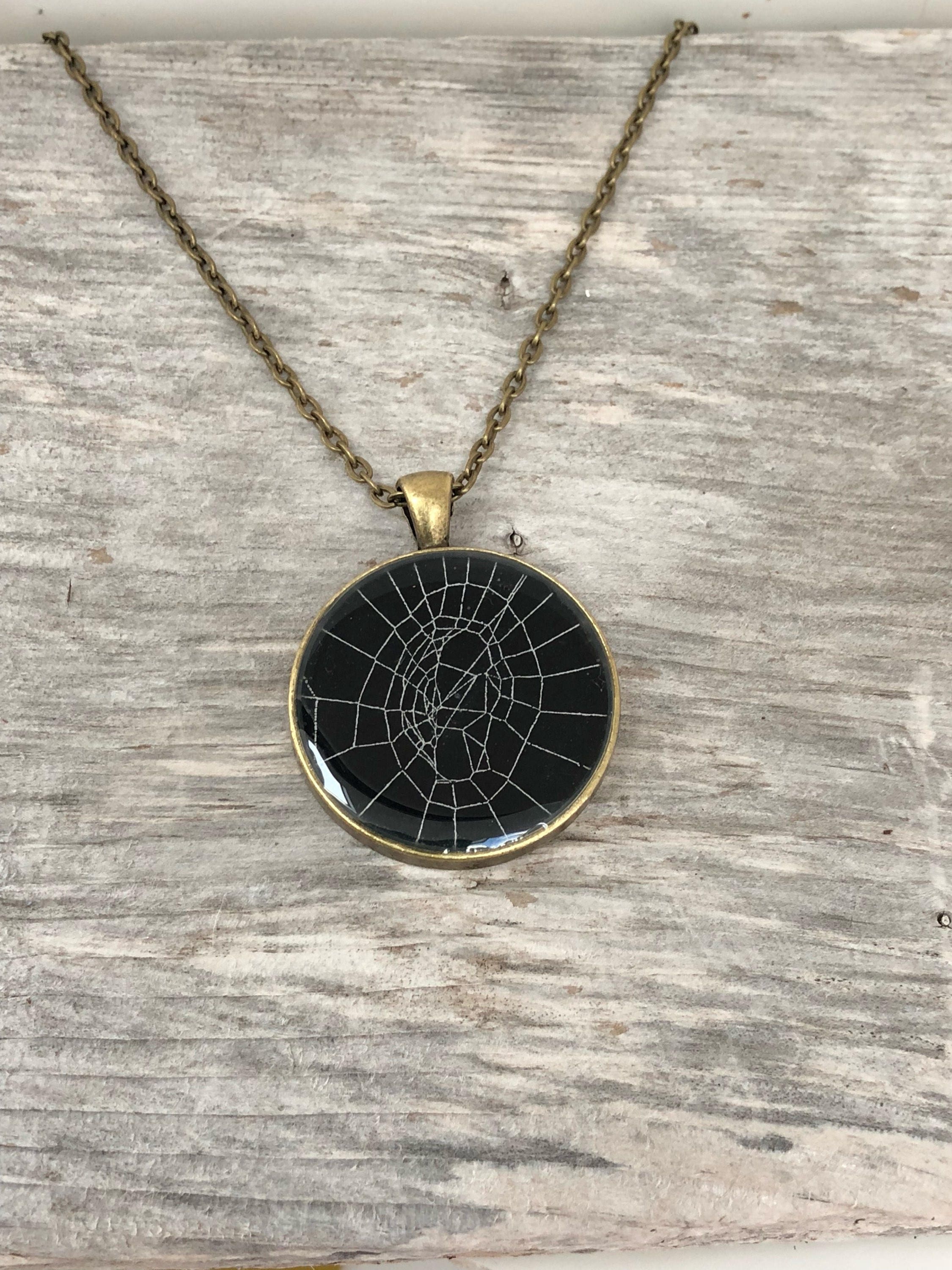 This is a REAL, Preserved spider web in resin on black paper. The web is sealed in a antique bronze 30mm Diameter Round pendant. 1 3/16” in diameter. Made from a strong metal alloy.