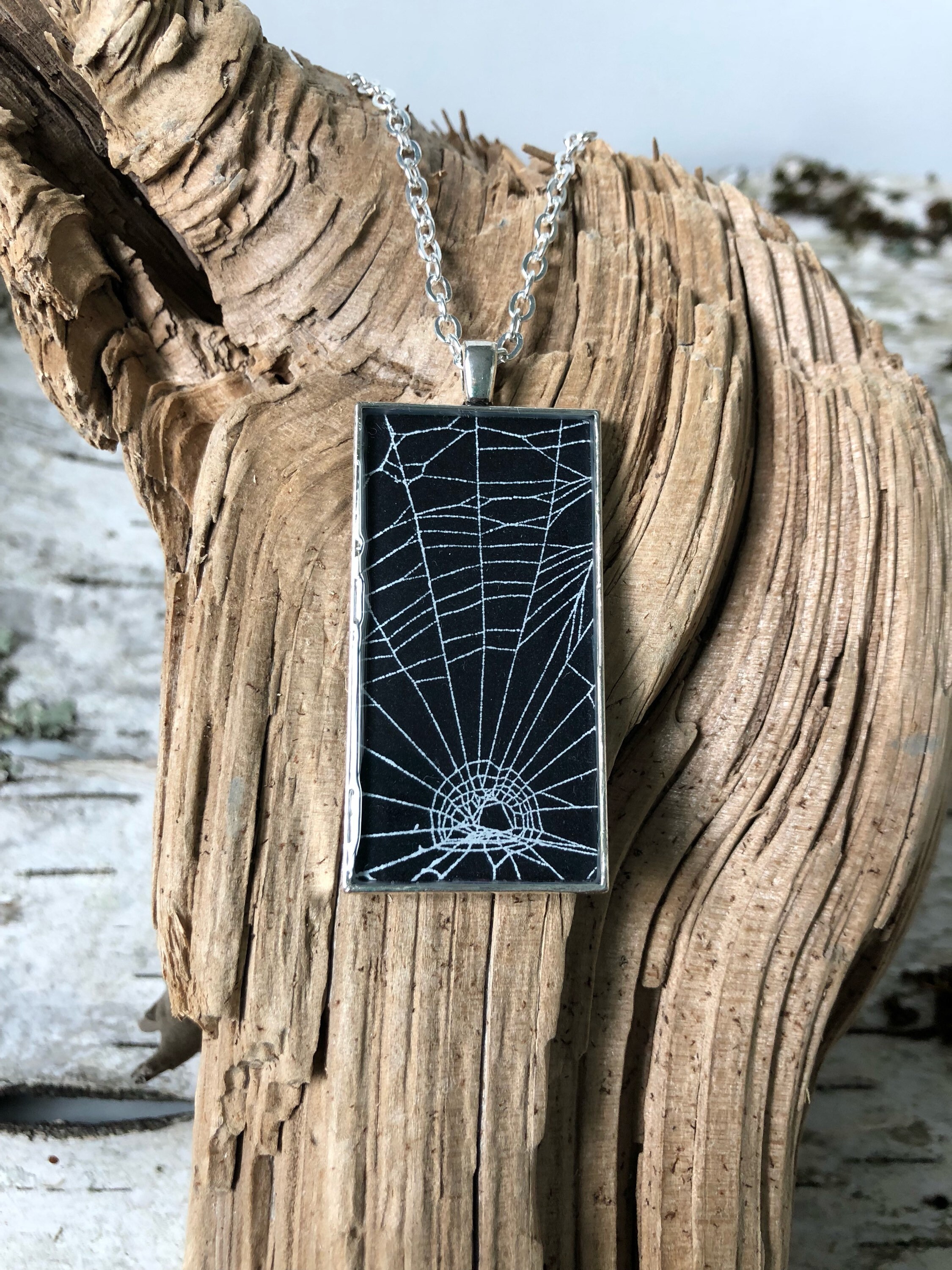 This is a Preserved spider web in a jewelry grade resin on Black paper. The web is sealed in a antique silver tone, Rectangle pendant. It measures 1” wide X 2” long.