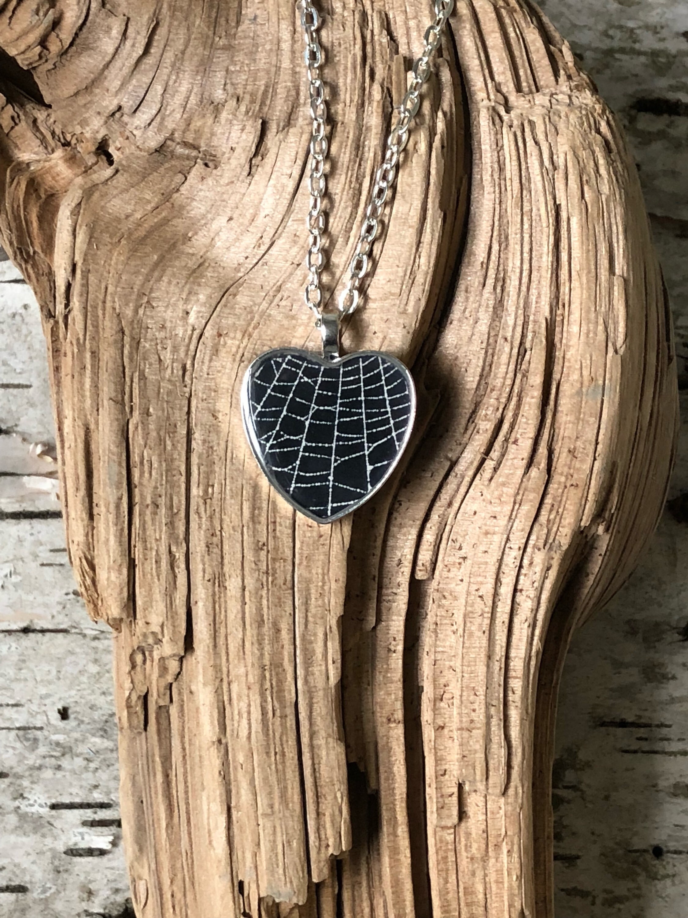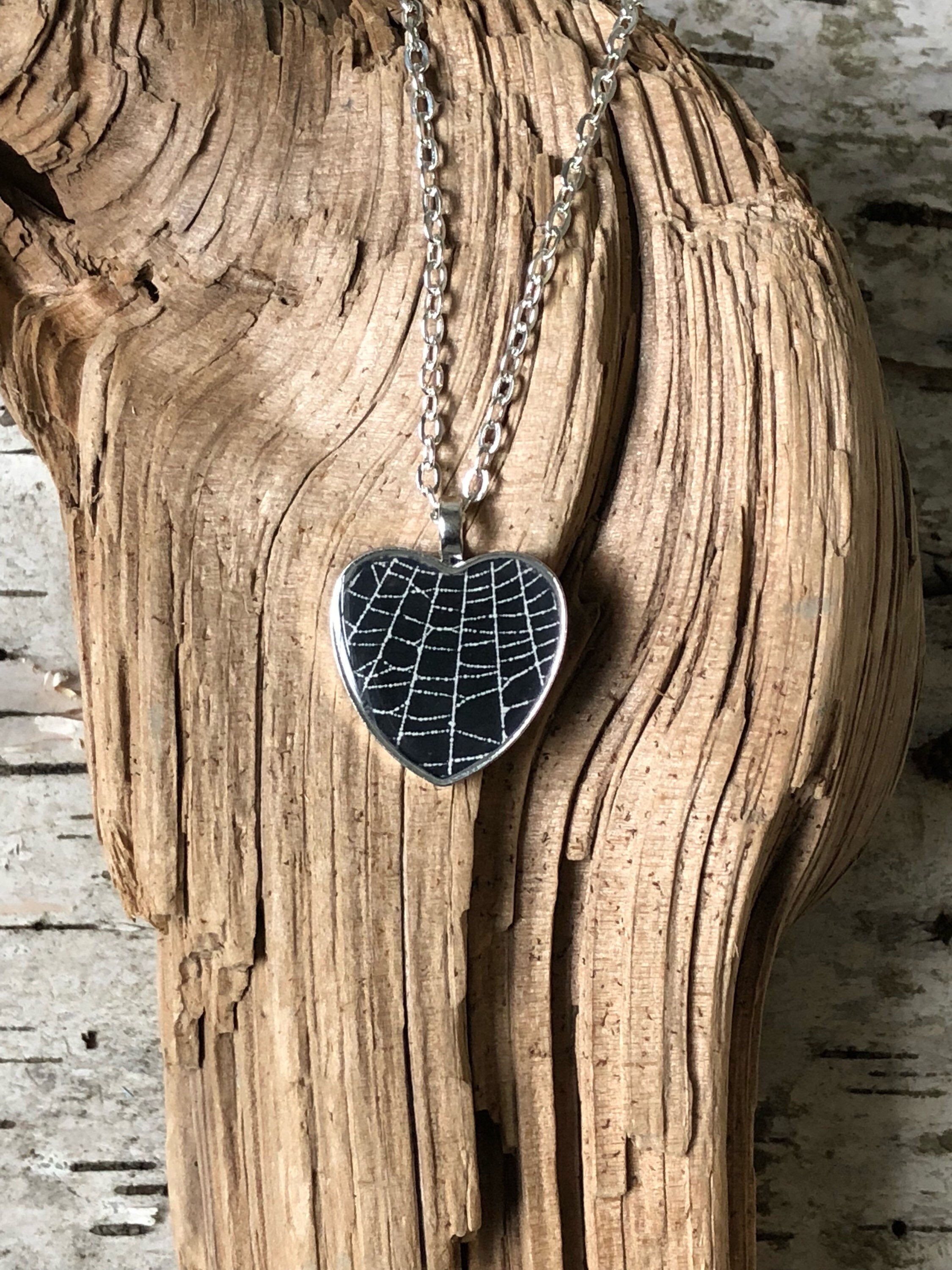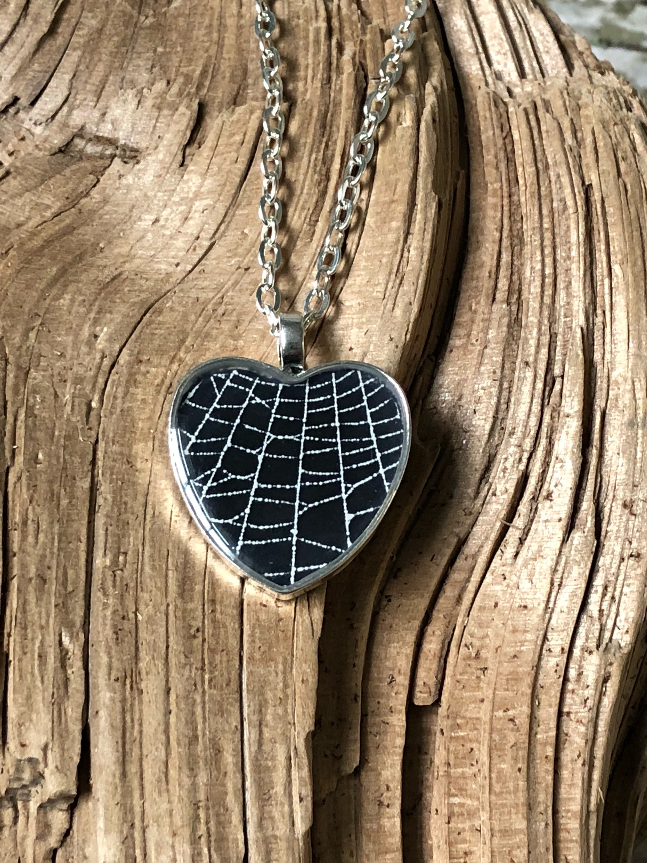 This is a REAL, Preserved spider web in resin on Black paper. The paper is then set in a silver tone heart bezel and sealed with jewelry grade resin. This is truly a one of a kind piece.
