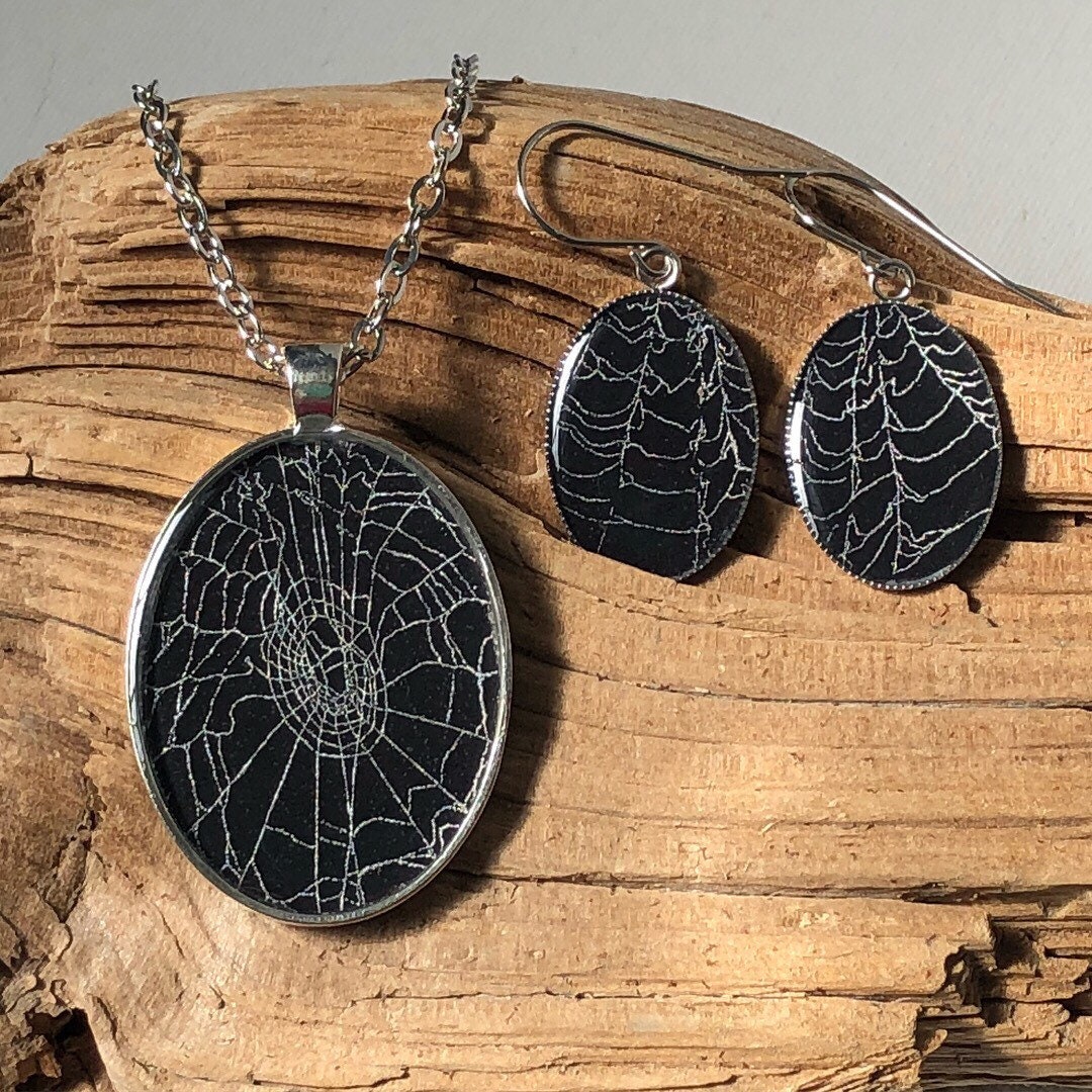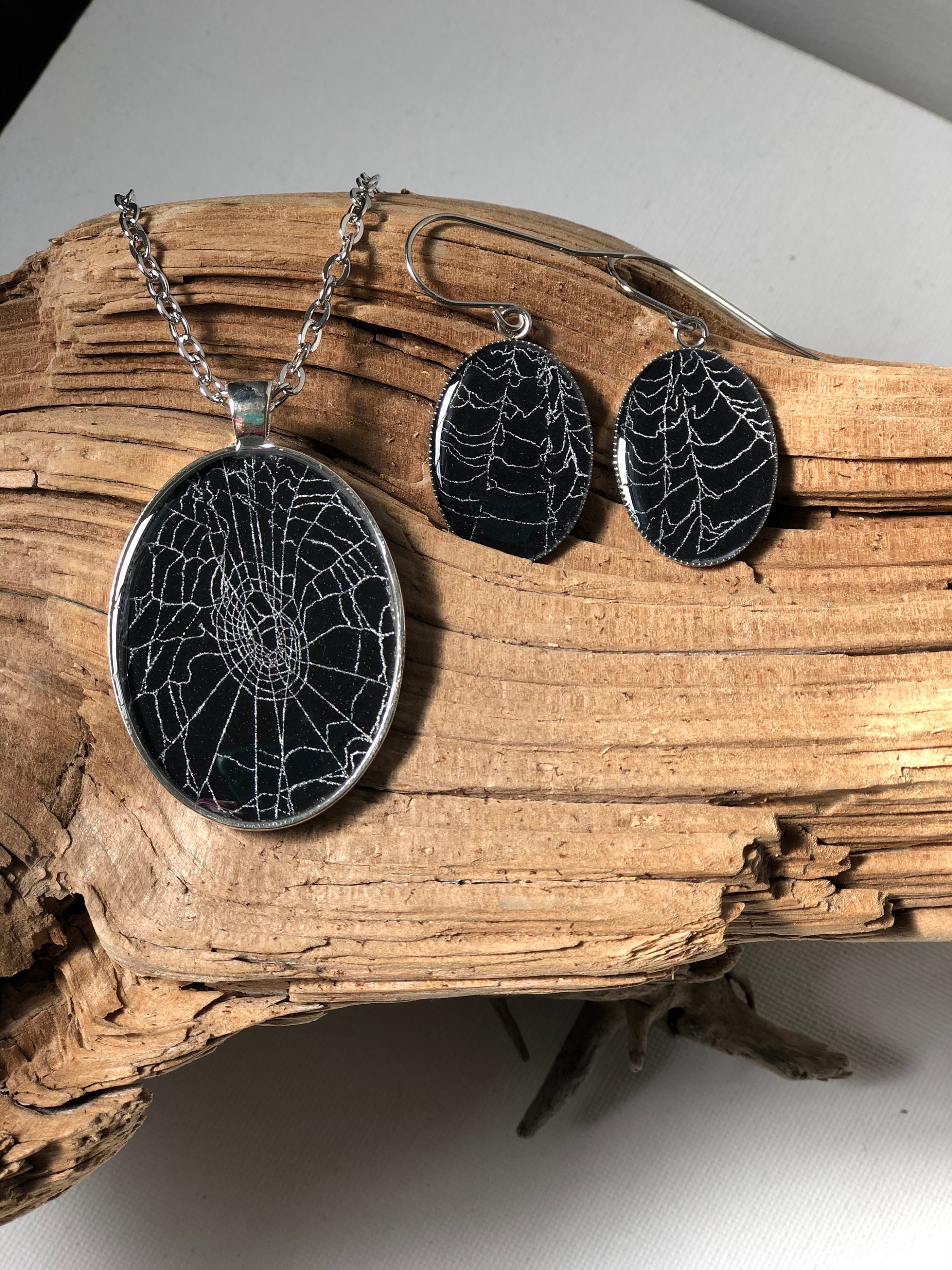 This is a Genuine Preserved spider web in resin on a Black paper. The web is sealed in a Antique Silver tone 1 inch wide X 2 inch long oval pendant. The web is preserved with a silver paint, it glistens when the light hits it the right way. The pendant has the center of the web in it, I like to call it home plate for the spider.