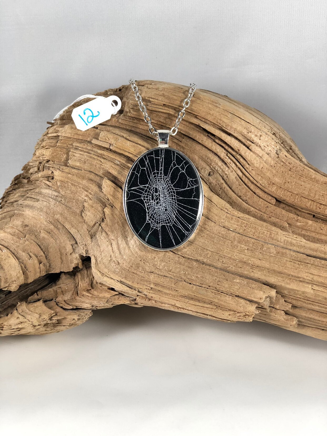 This is a REAL, Preserved spider web in resin on black paper. The web is sealed in a Beautiful antique silver tone 30mm X 40mm long oval pendant.