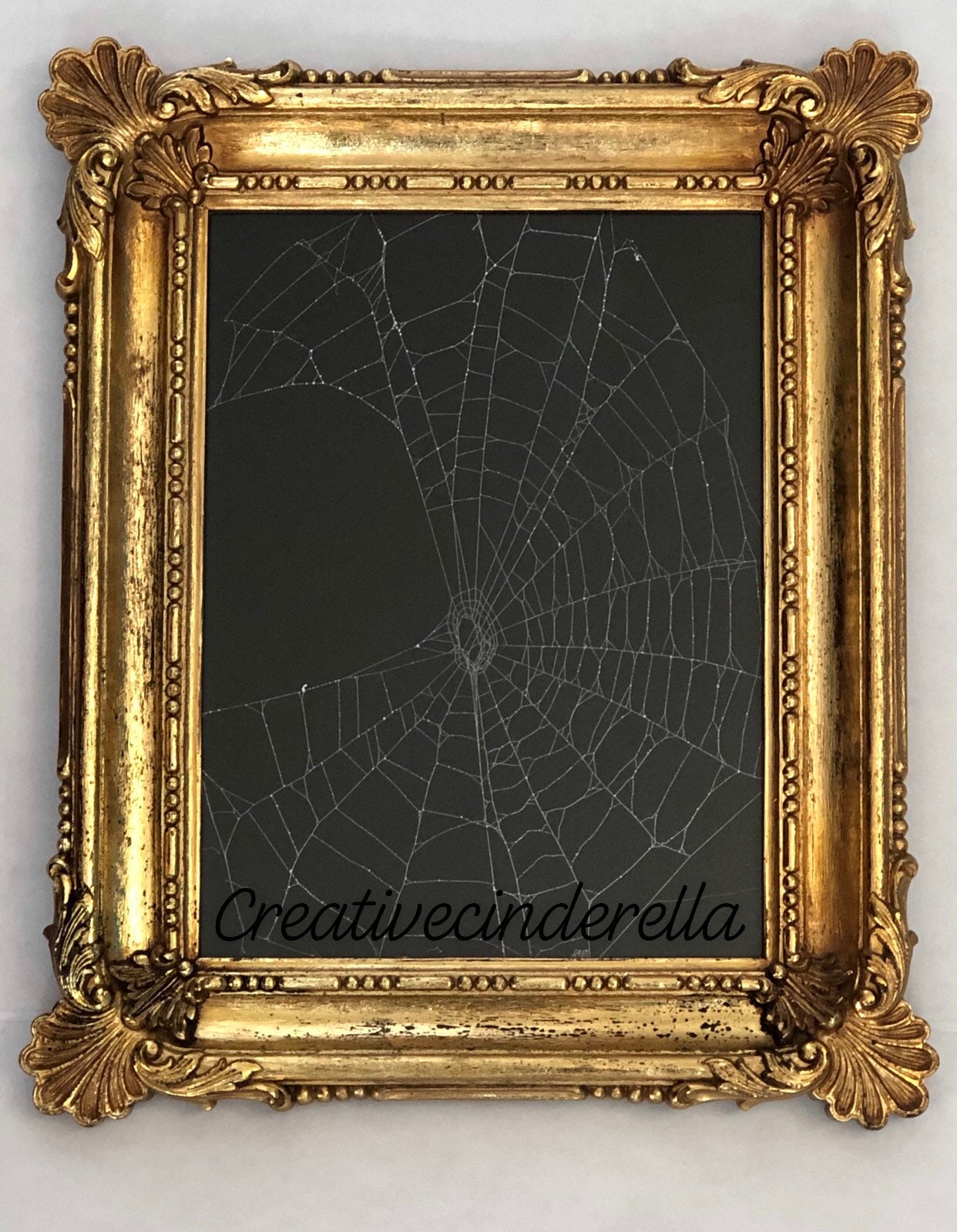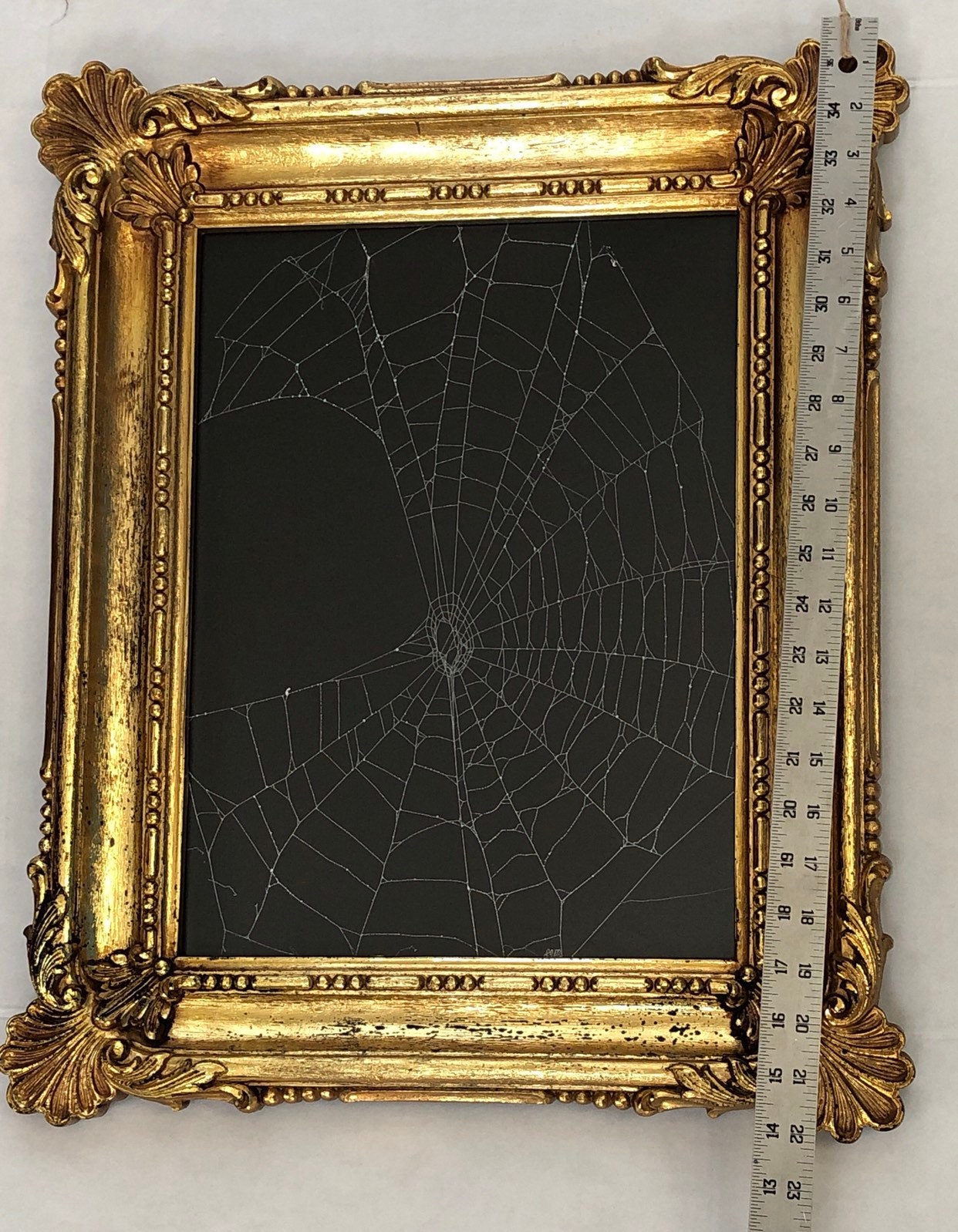 This is a Real Preserved Spider Web, Preserved onto a black canvas board. It has been sealed and placed under glass in this gorgeous, vintage, gold frame. The frame measure 18” x 22”.