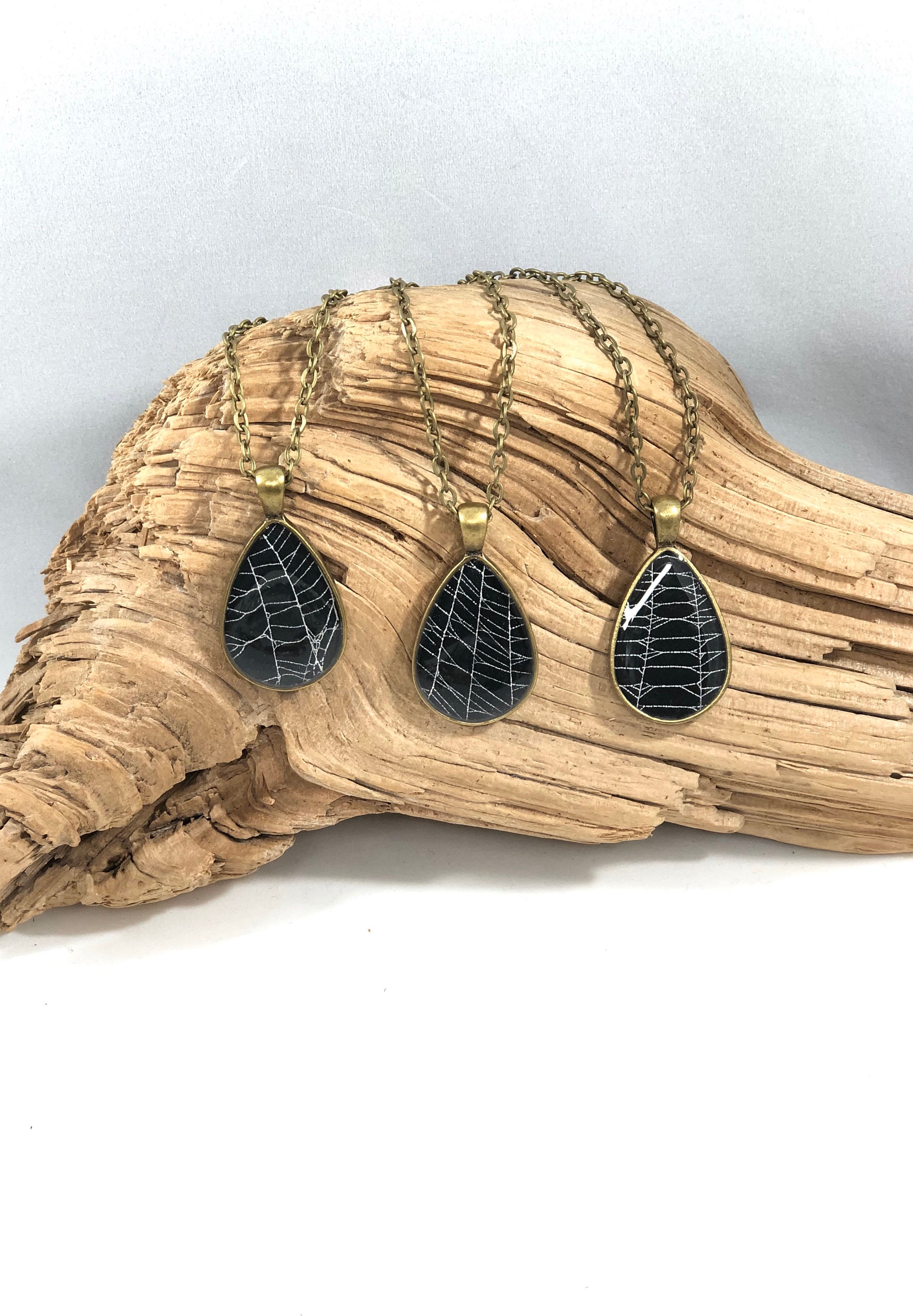 This is a REAL, spider web preserved on Black paper sealed with a UV protected, Eco friendly resin. It is then set in an antique bronze, one inch Teardrop bezel. This is truly a one of a kind piece.