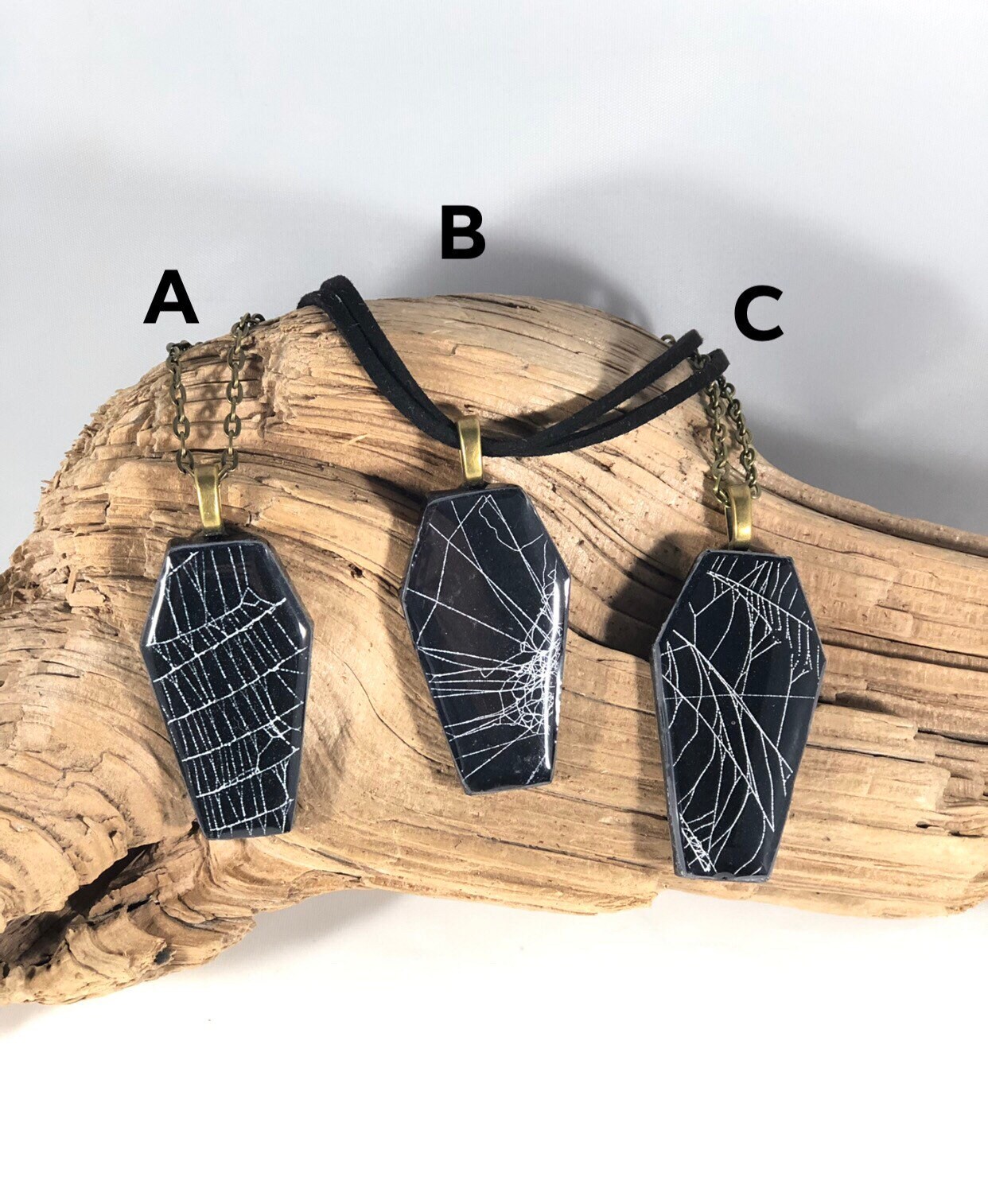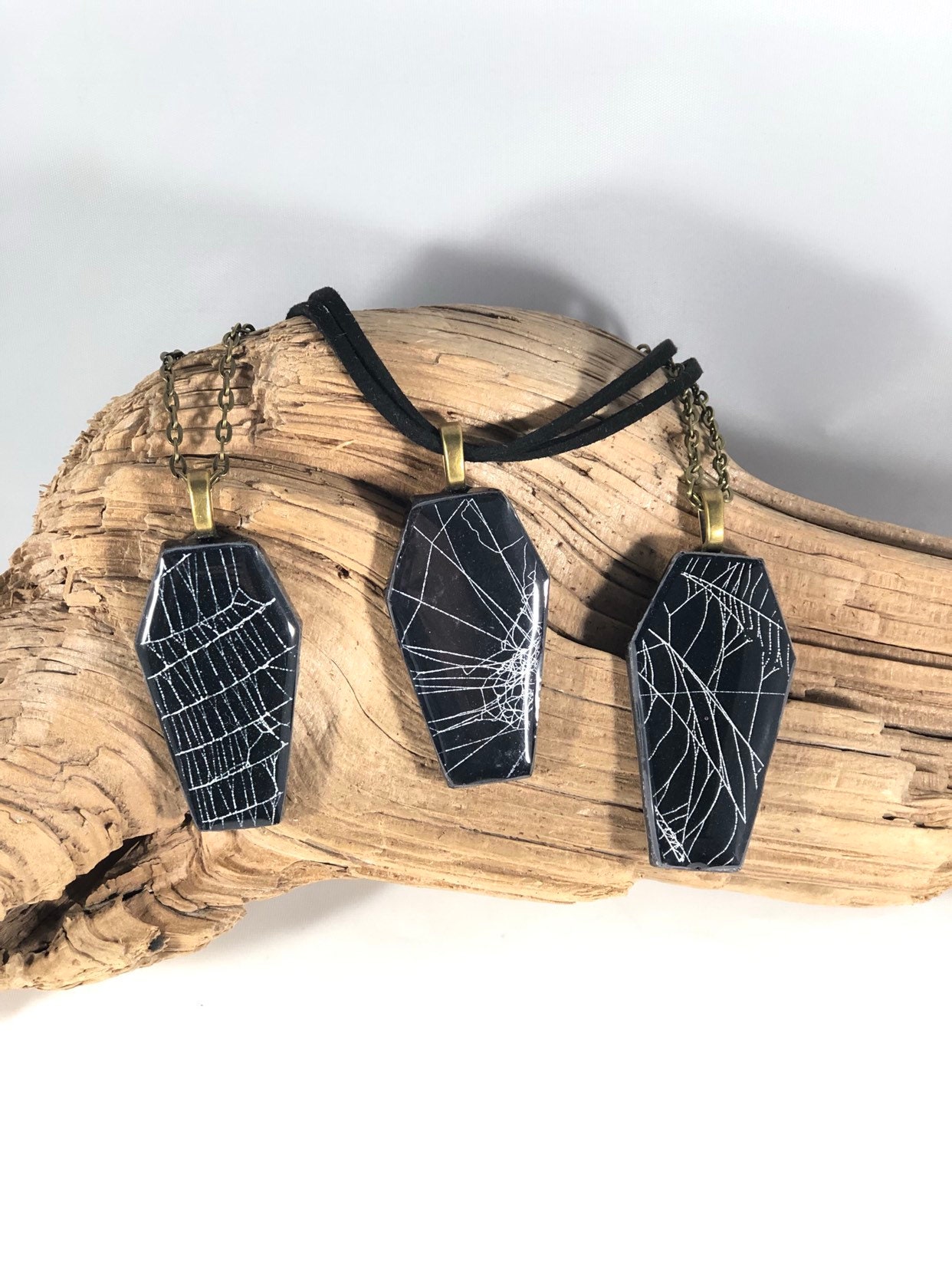 This is a REAL Spider Web preserved on Black paper. The web is sealed in resin set in solid resin. The pendants are coffin shape and measure 1” wide X 2” long.