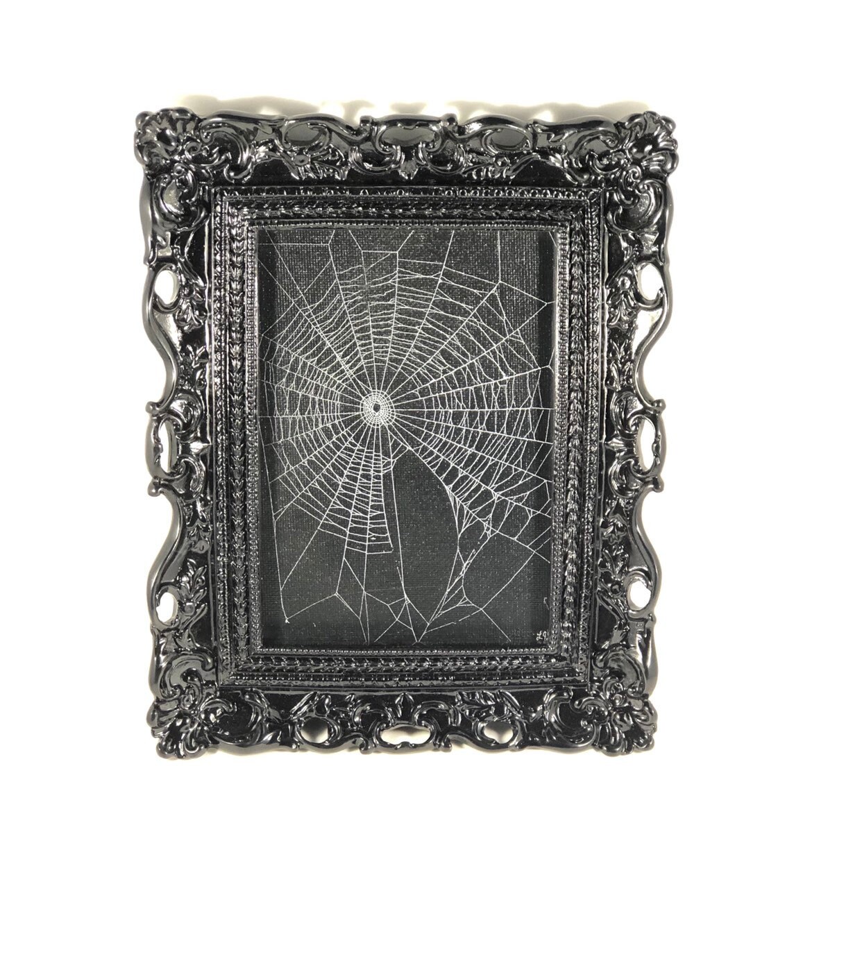 This is a Real Spider Web, Preserved onto a black canvas board. It has been sealed and placed under glass in Black Ornate Victorian frames.