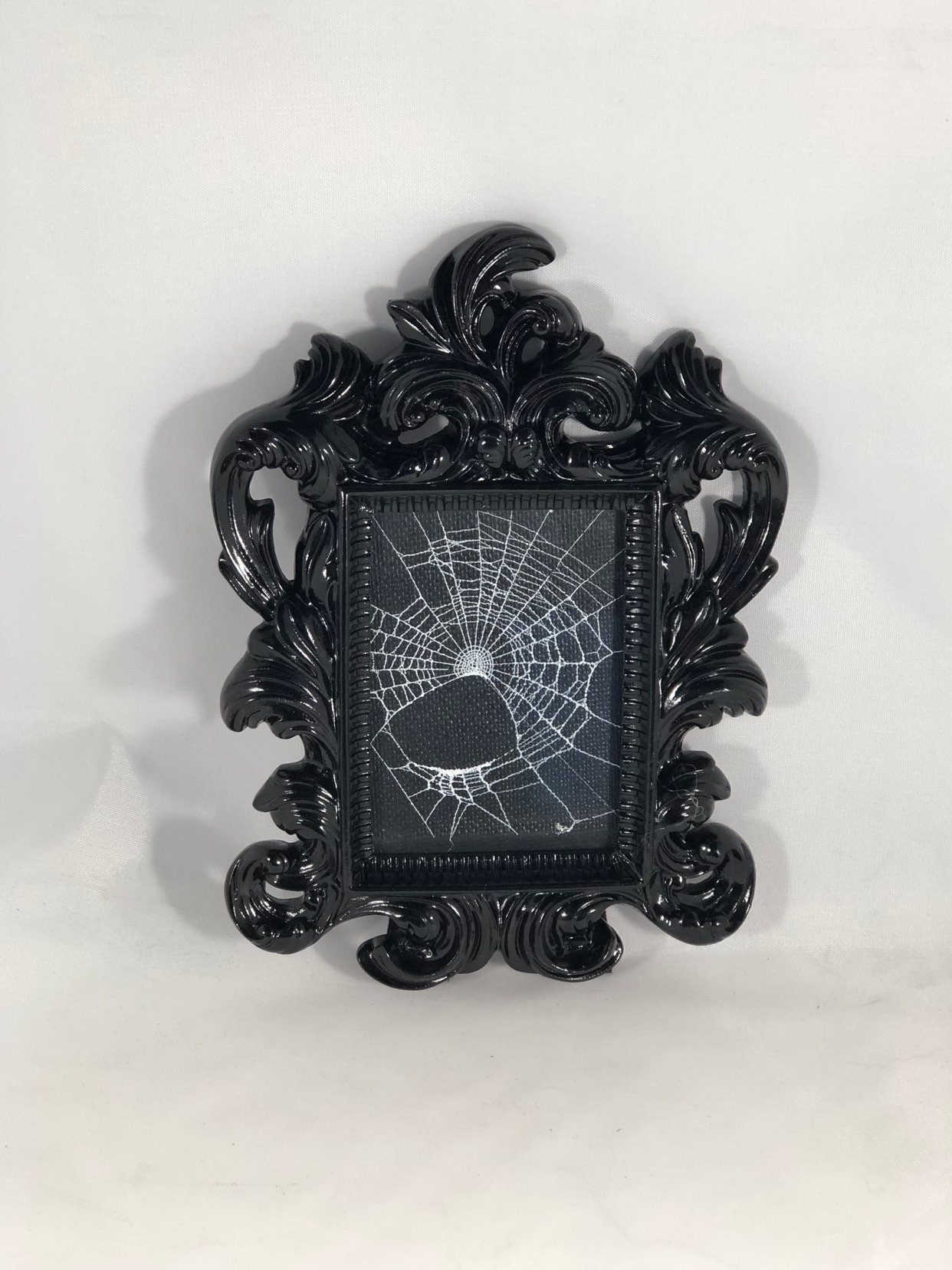The web is framed under glass in this small But very ornate black frame.