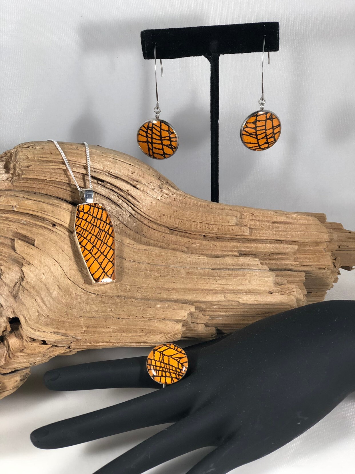 This is a REAL spider web preserved on orange paper sealed in jewelry grade resin. The web is set in a Coffin shaped .925 Hand crafted sterling Silver bezel pendant.