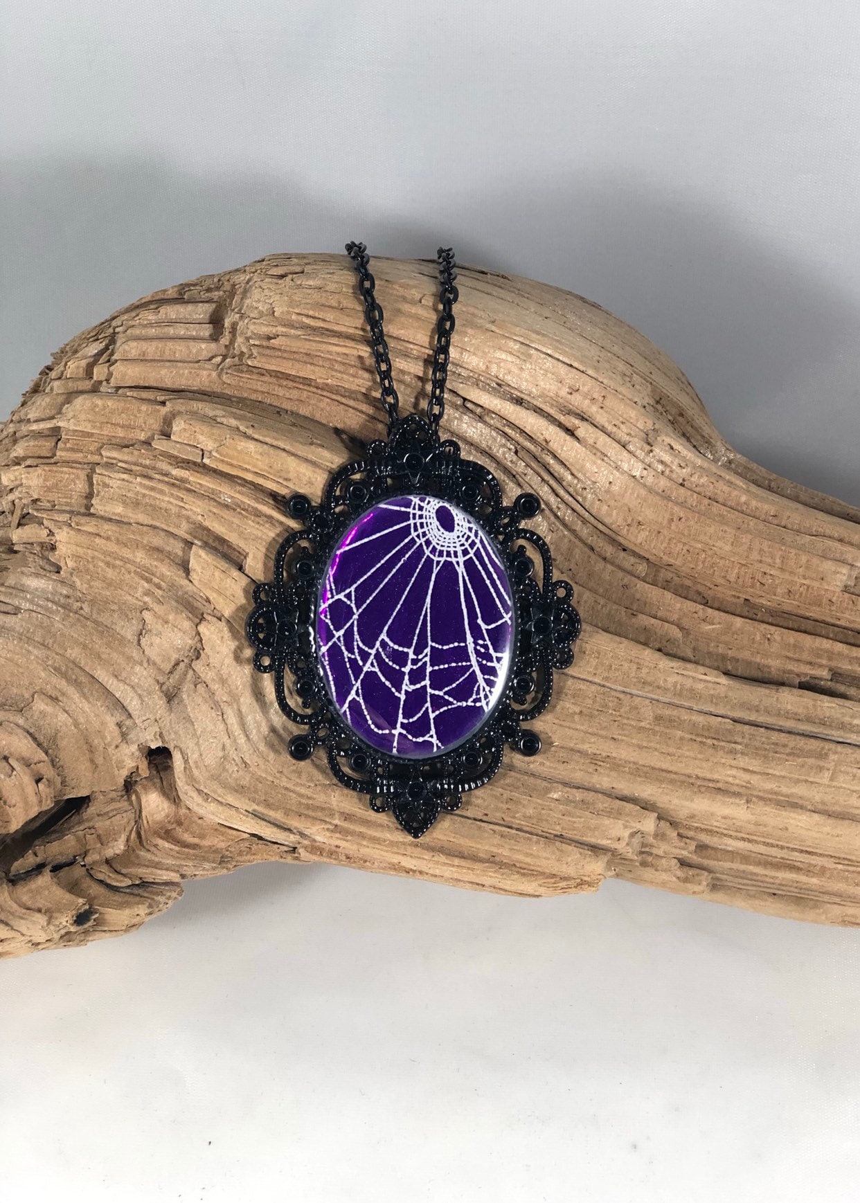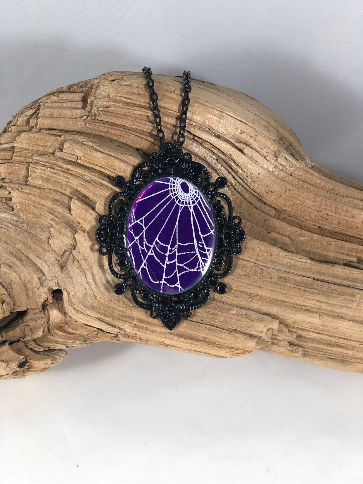 This is a Genuine, Real spider web preserved on Purple Metallic paper. The web is sealed with Jewelry grade resin in a Black Ornate oval Gothic / Victorian style pendant. It measures in total 6.5 cm long x 5 cm wide (2 1/2” L X 2”w)