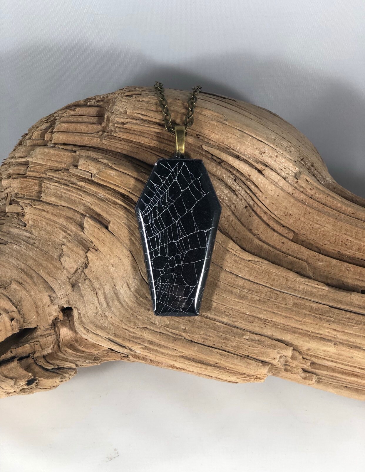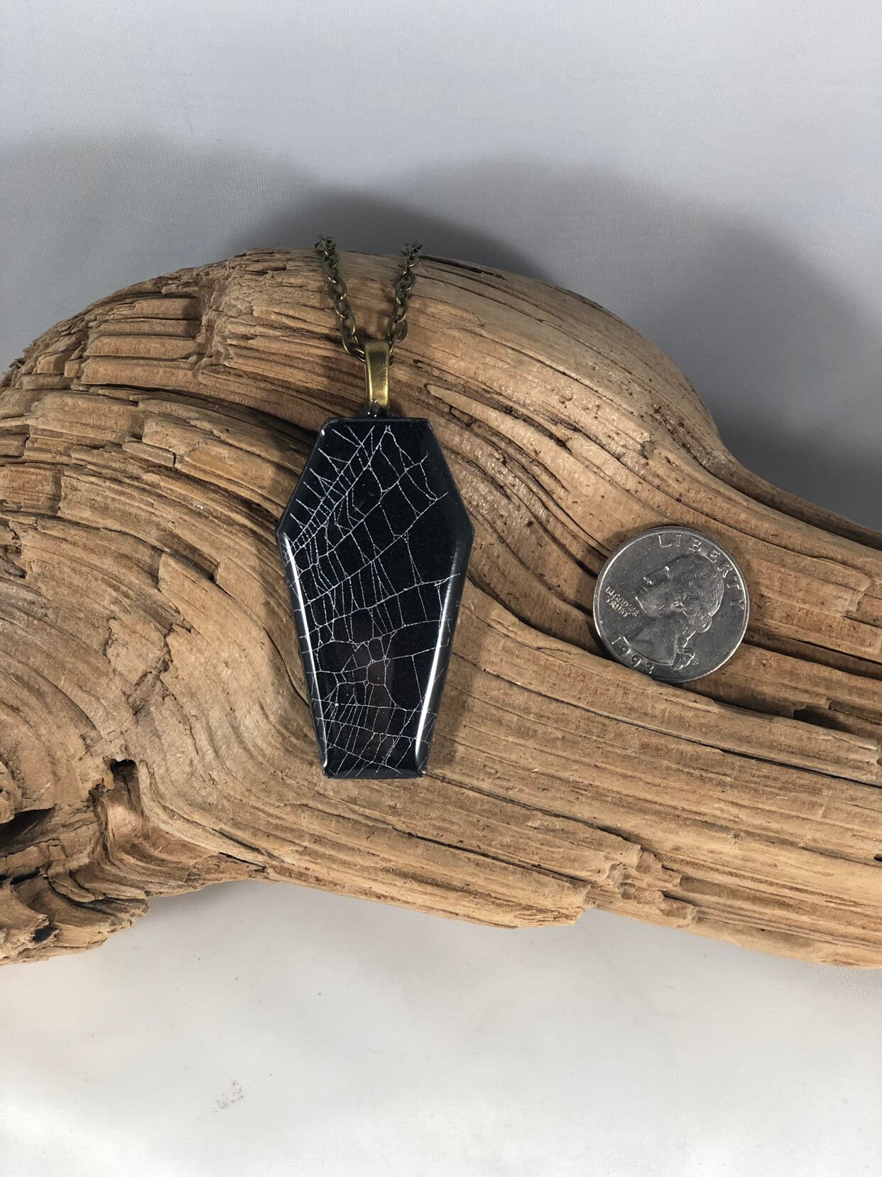 This is a REAL Spider Web preserved on Black paper. The web is sealed in resin set in solid resin. The pendants are coffin shape and measure 1” wide X 2” long.