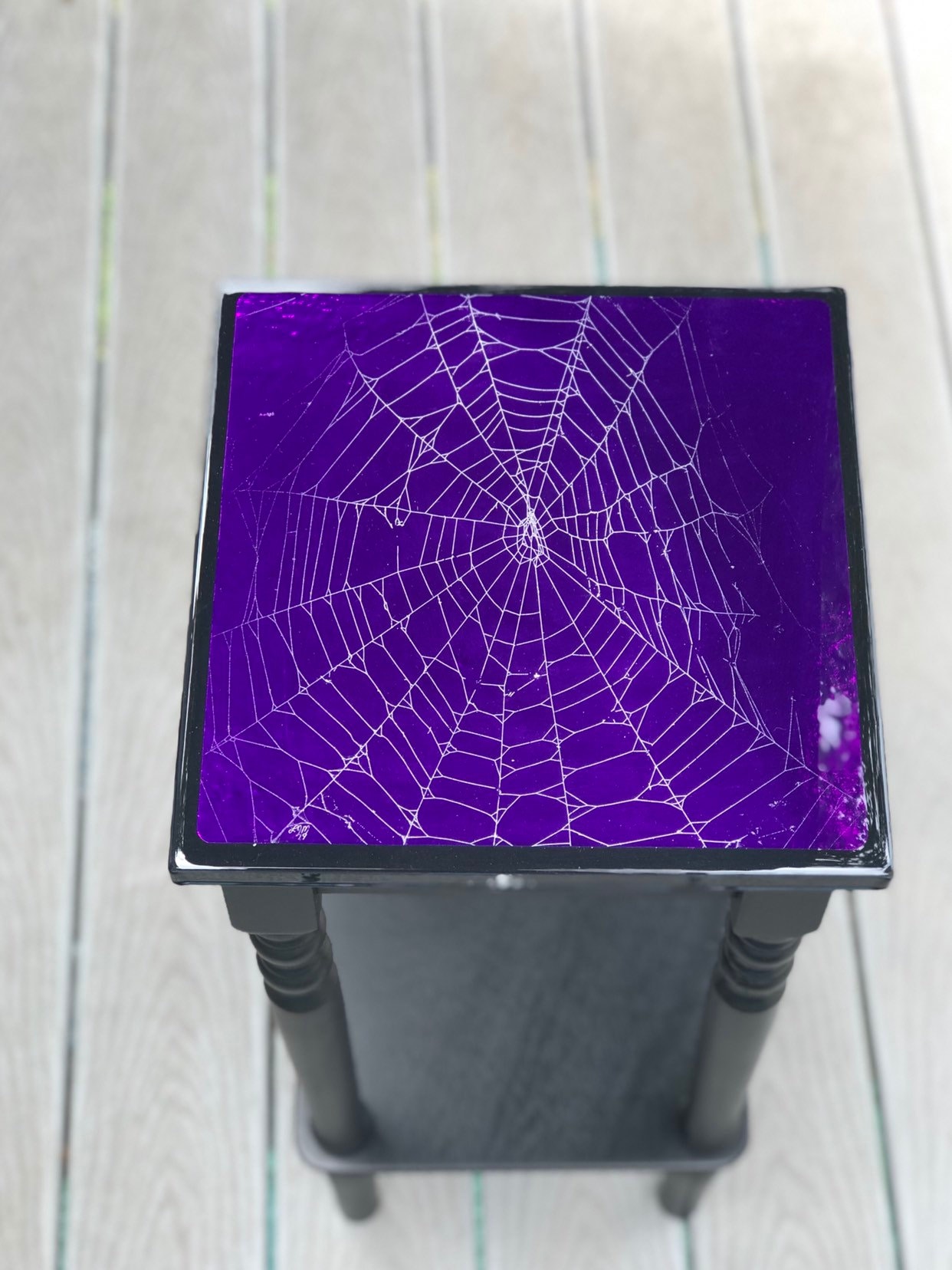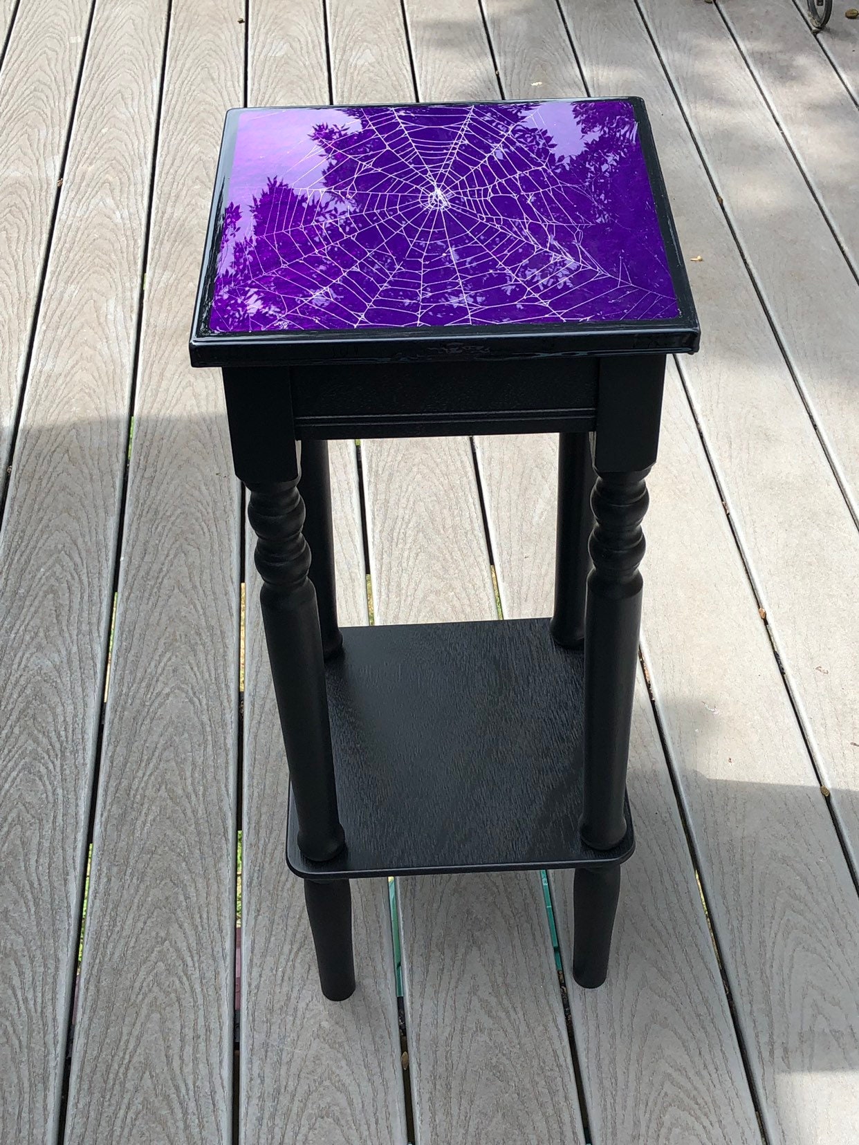 This is a Genuine Spider Web Preserved on Special Purple paper. The web has been set and sealed onto a black accent table. The table measures 11 3/4” square and is 28”inches high. The table has been sealed with a UV protected Eco friendly resin to preserve and enhance its natural beauty.