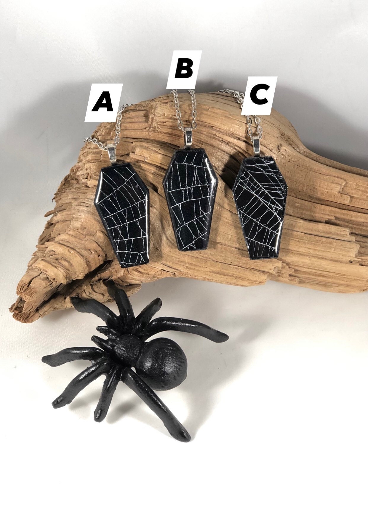This is a REAL Spider Web preserved on Black paper. The web is sealed in resin set in solid resin. The pendants are coffin shape and measure 1” wide X 2” long.