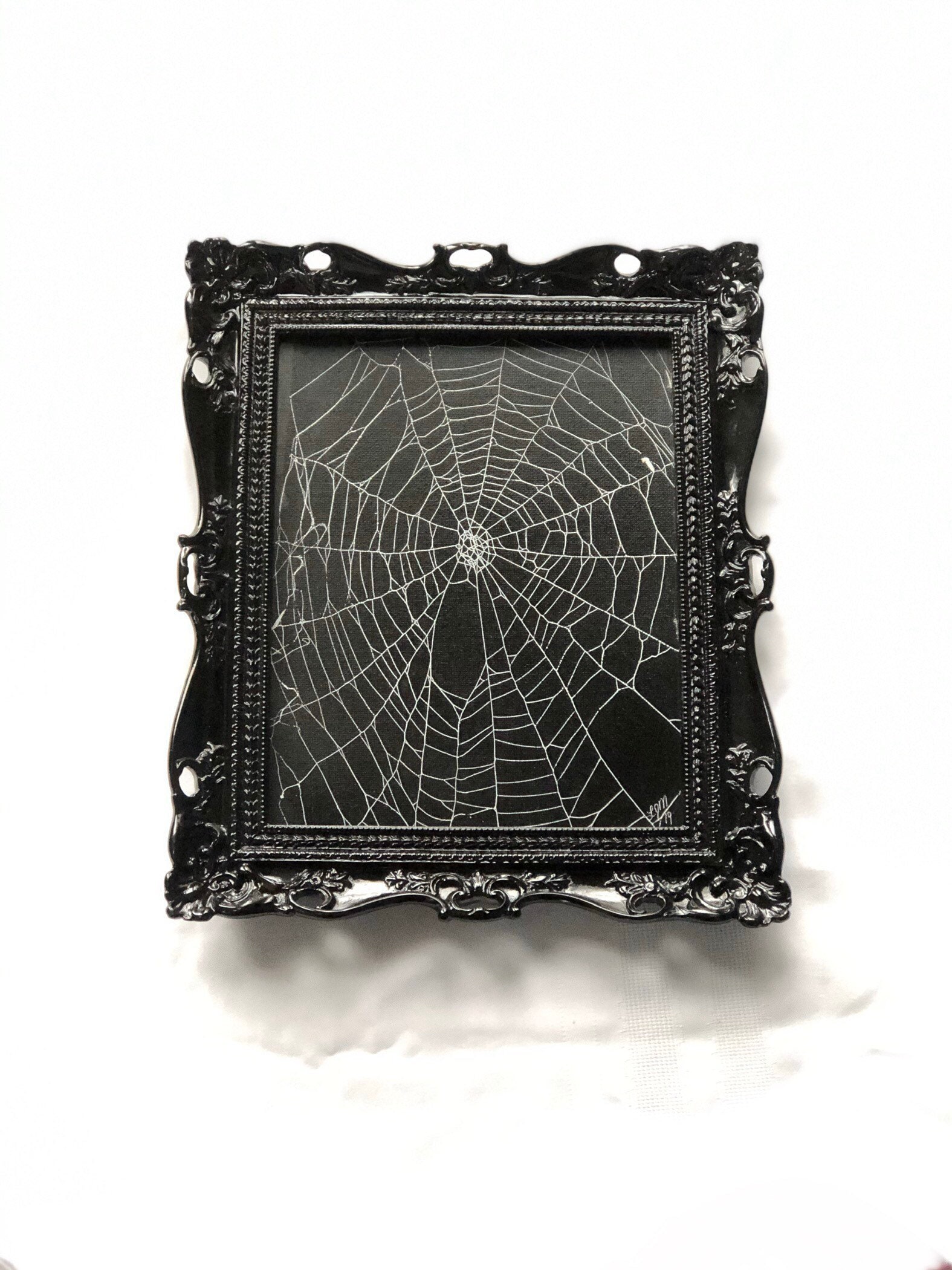 This is a Real Spider Web, Preserved onto a black canvas board. It has been sealed and placed under glass in Black Ornate Victorian frames.