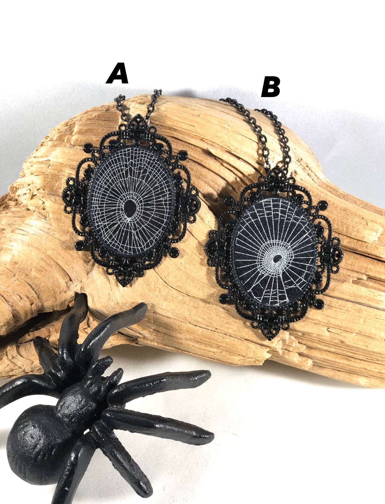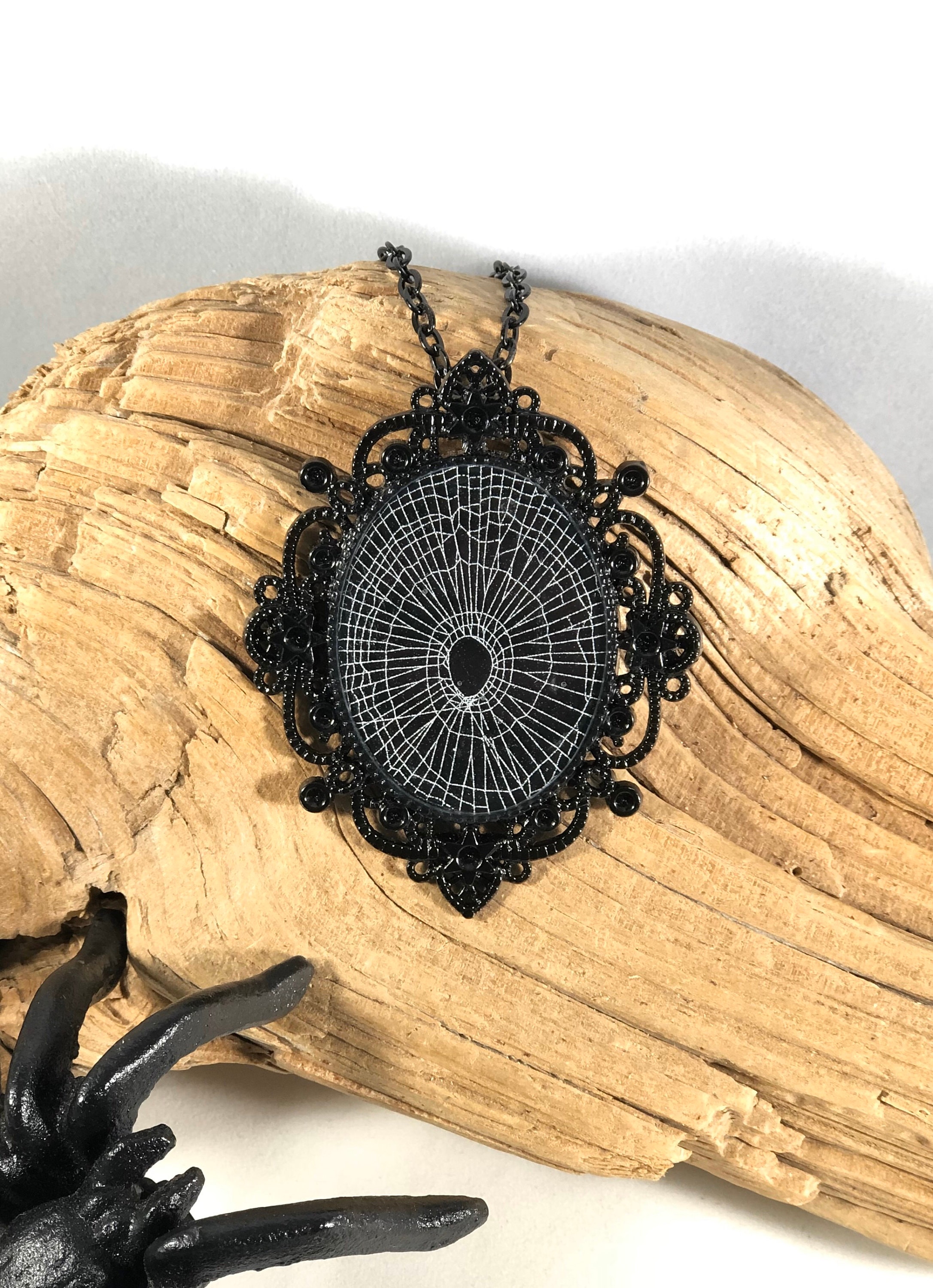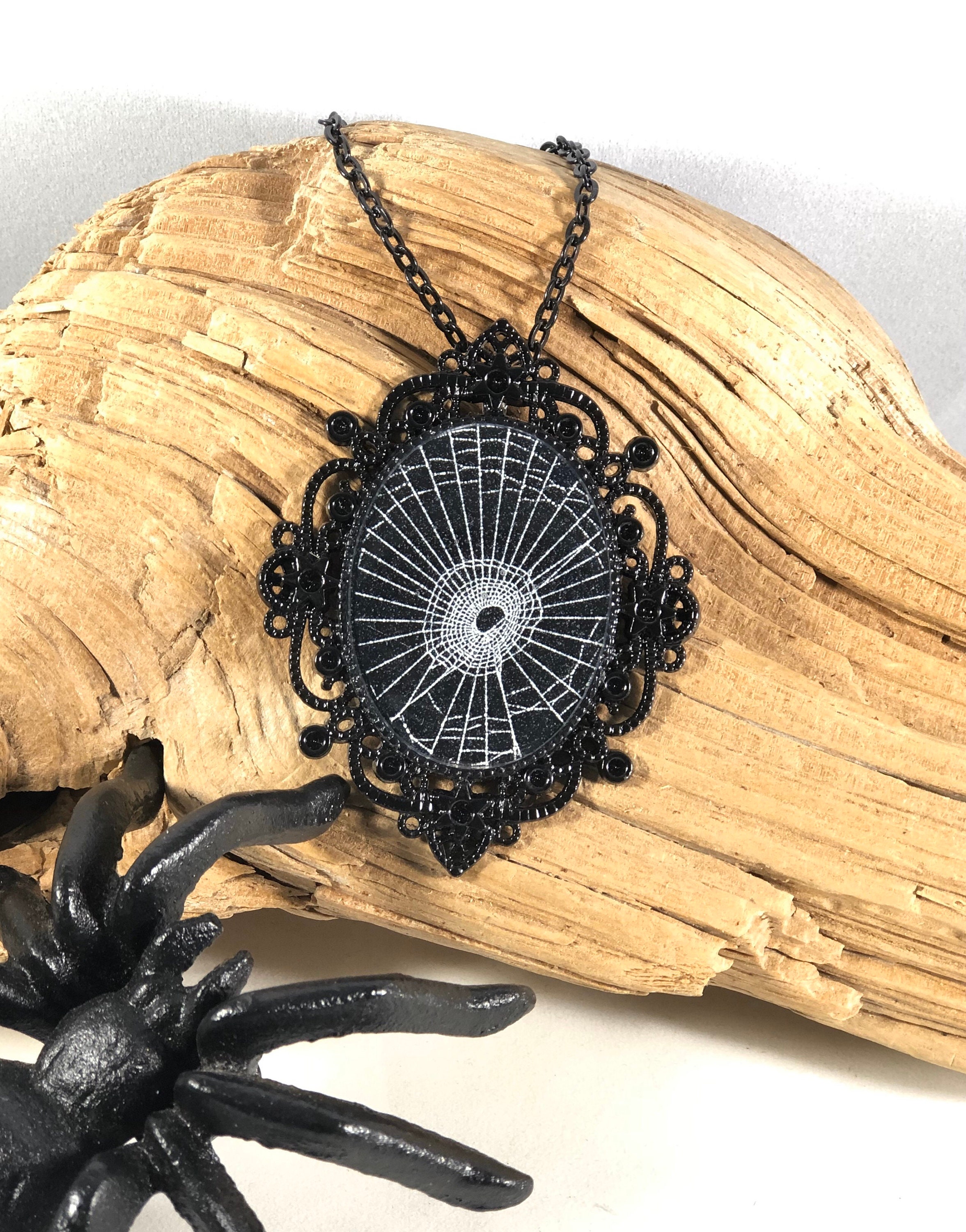 This is a Genuine Preserved spider web, preserved on black paper. The web is then sealed in jewelry grade resin on a Beautiful Victorian Black 30mm X 40mm long oval pendants. Made from a strong metal alloy.