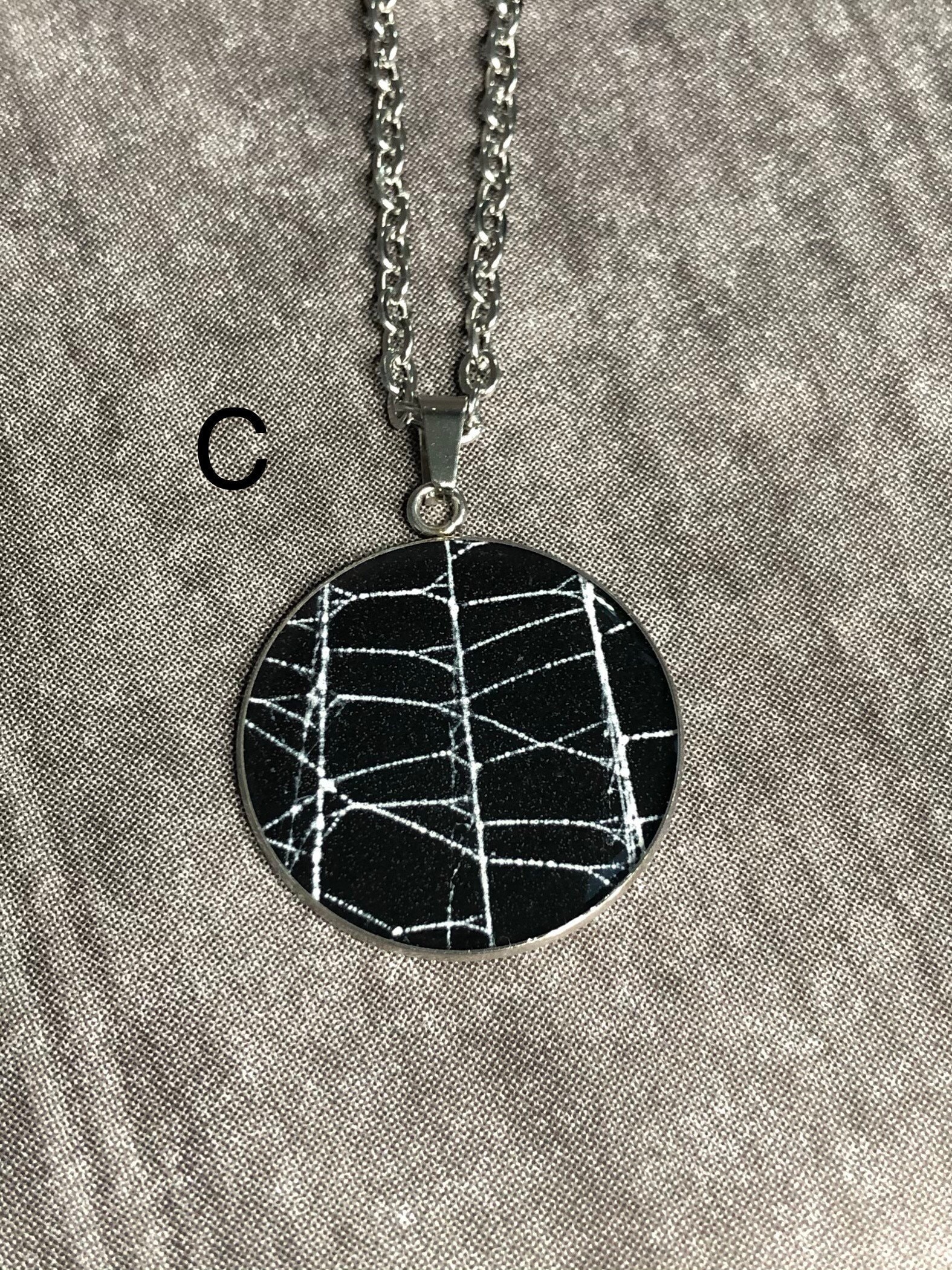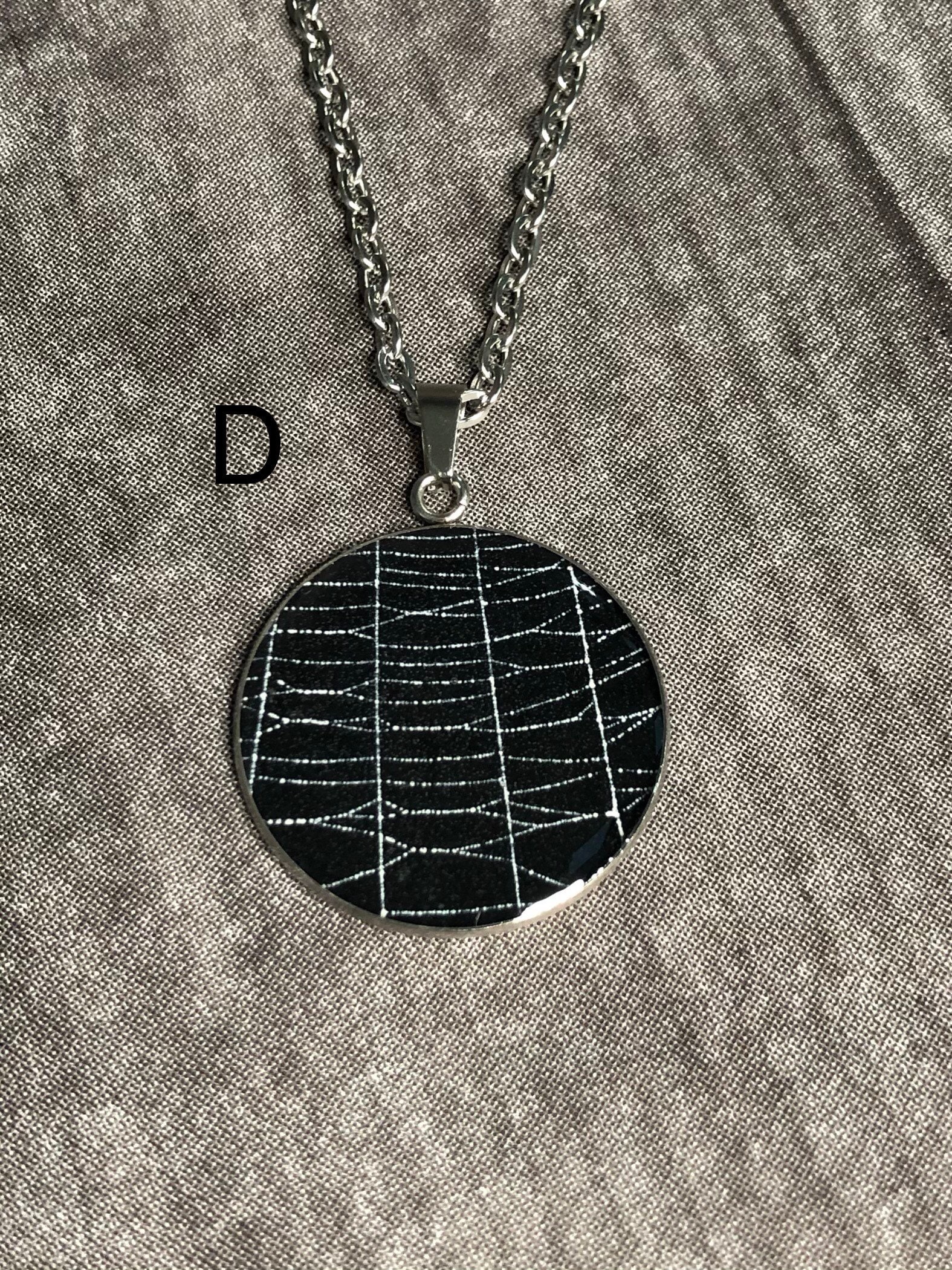 The whole pendant is then sealed in a UV protected resin, set in a 1 1/4 “ inch round surgical stainless steel pendant.