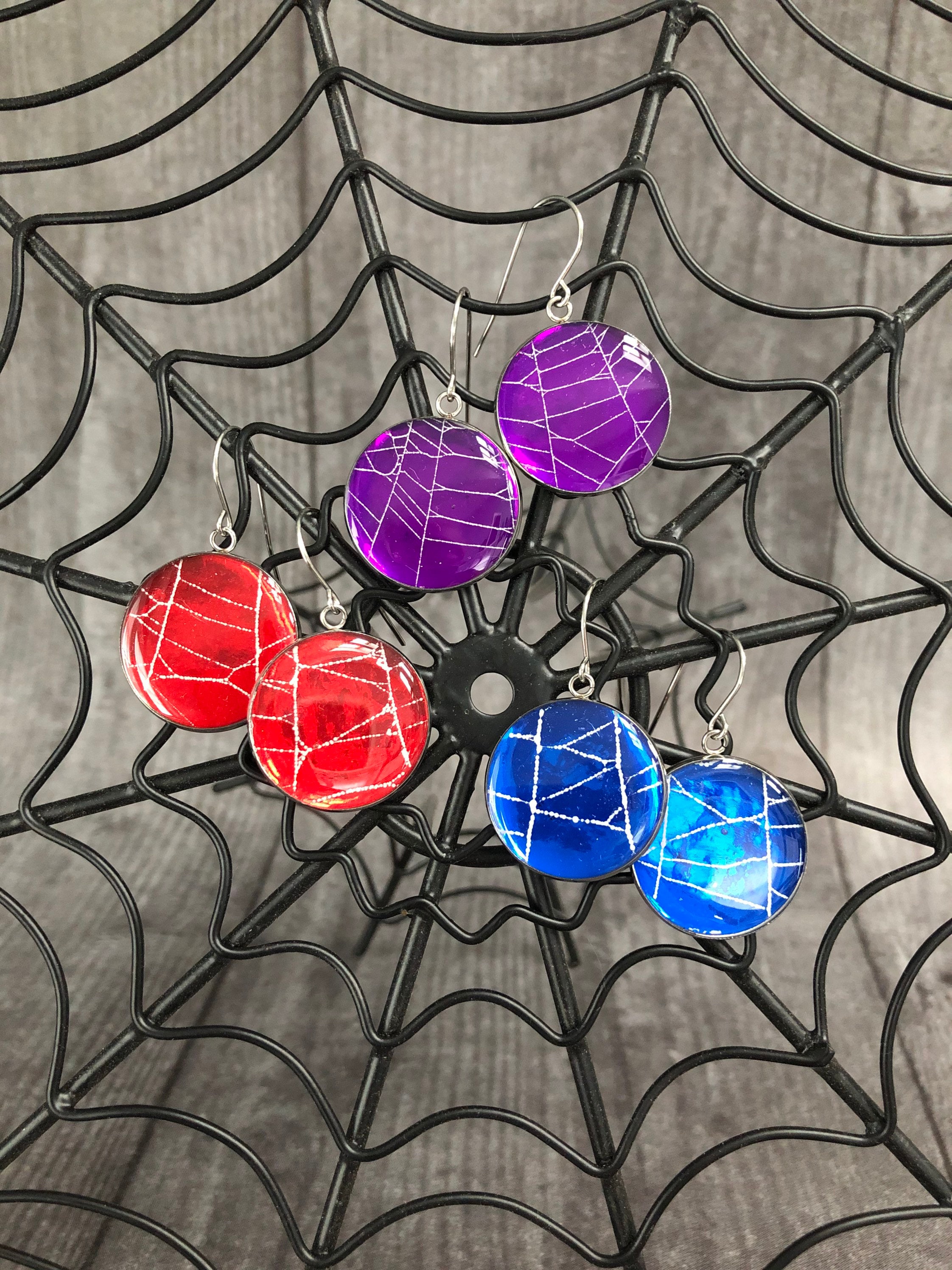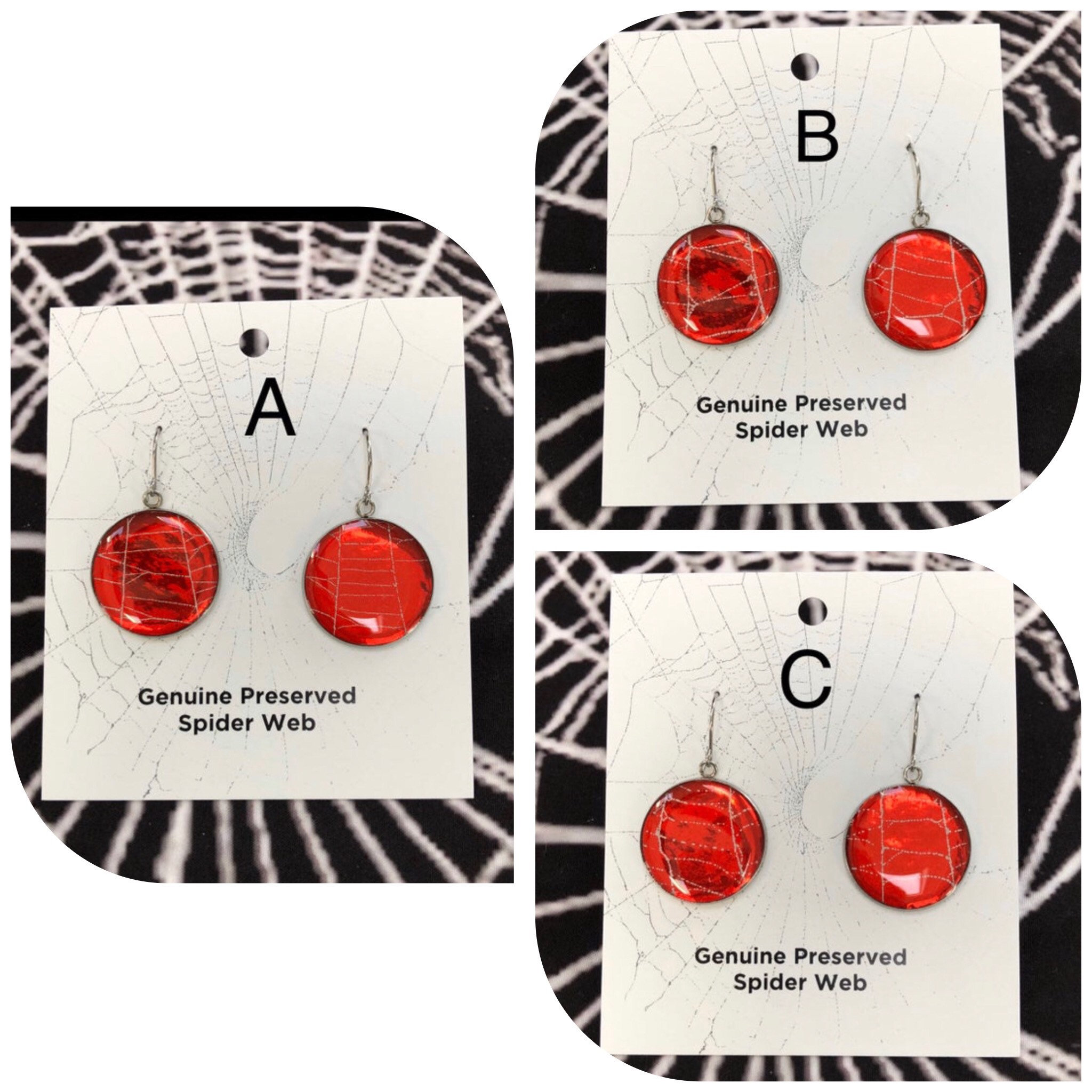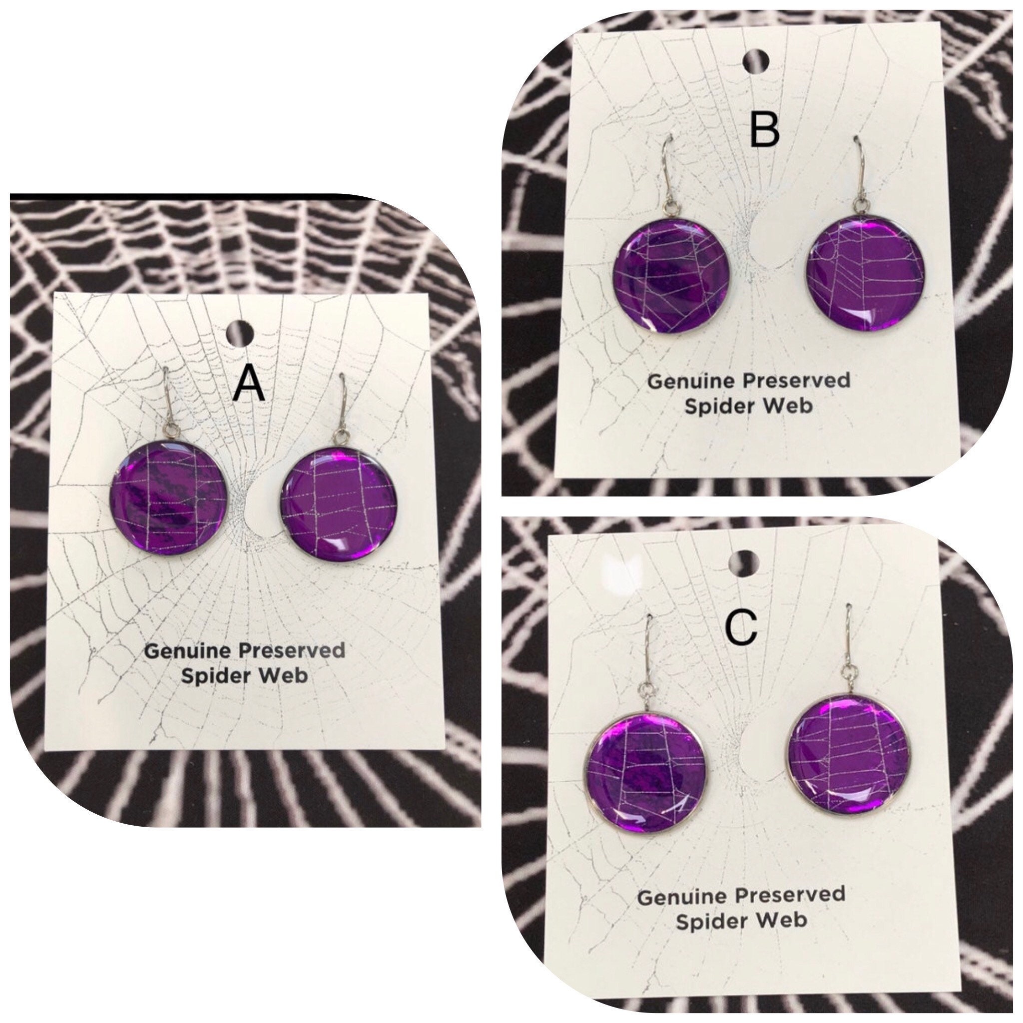 These are one of a kind round dangle earrings made with a Genuine Preserved Spider Web inside them. This is NOT a photo copy.