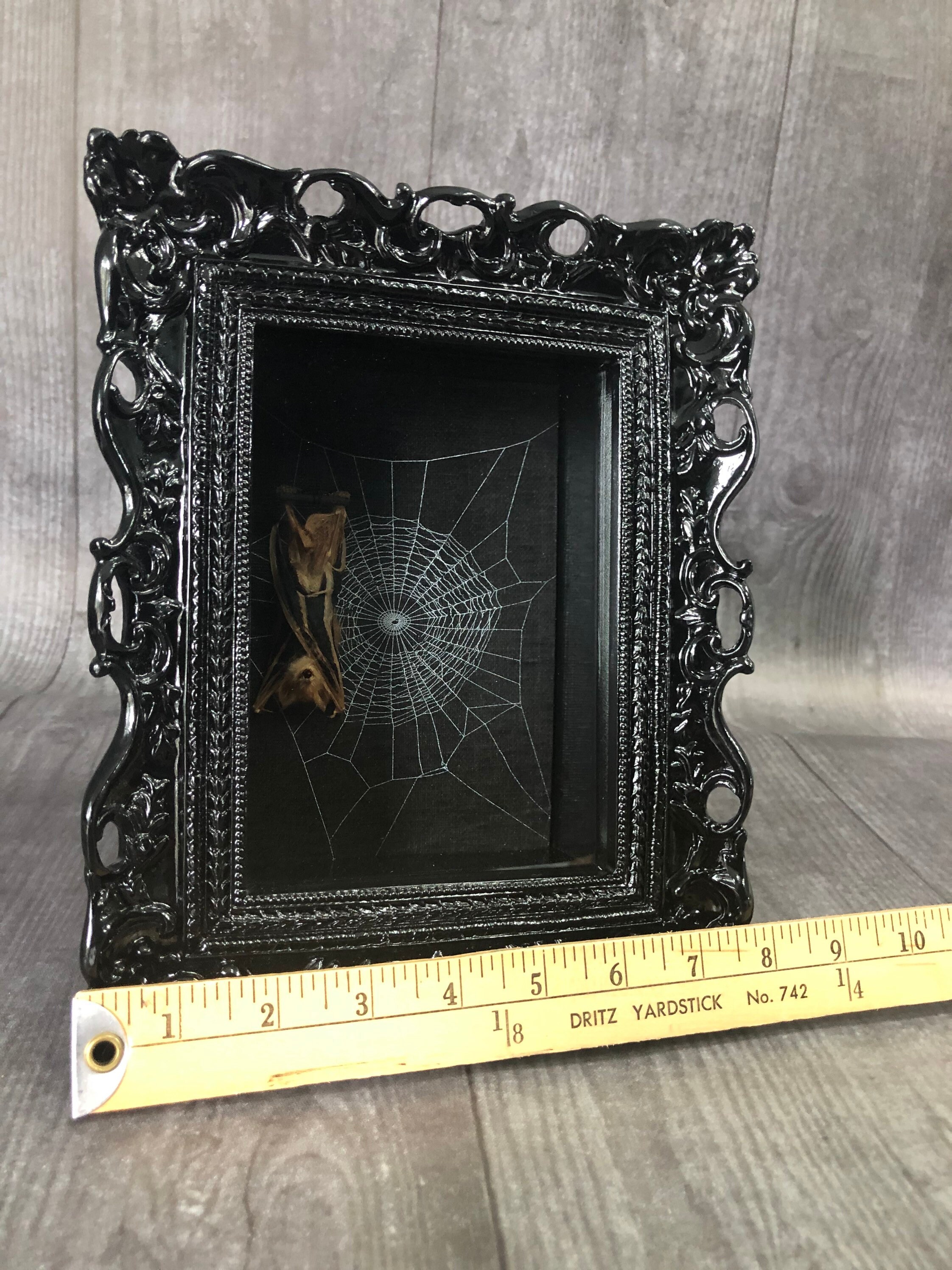 This is a Preserved Bat affixed to a Real Spider Web Preserved onto a black canvas board. It has been sealed and placed under glass in Black Ornate Victorian frames.