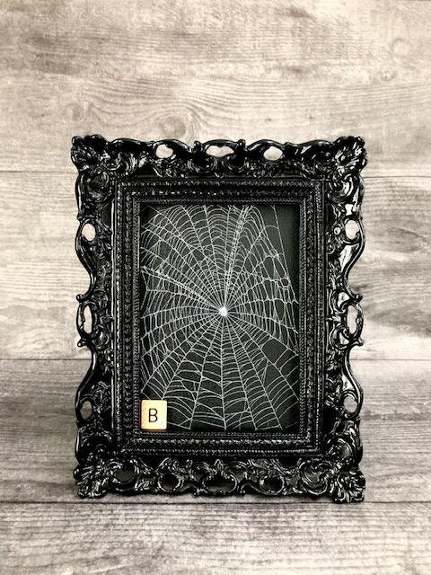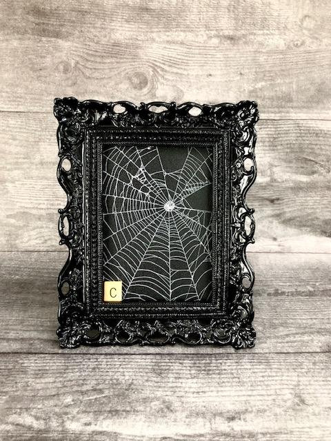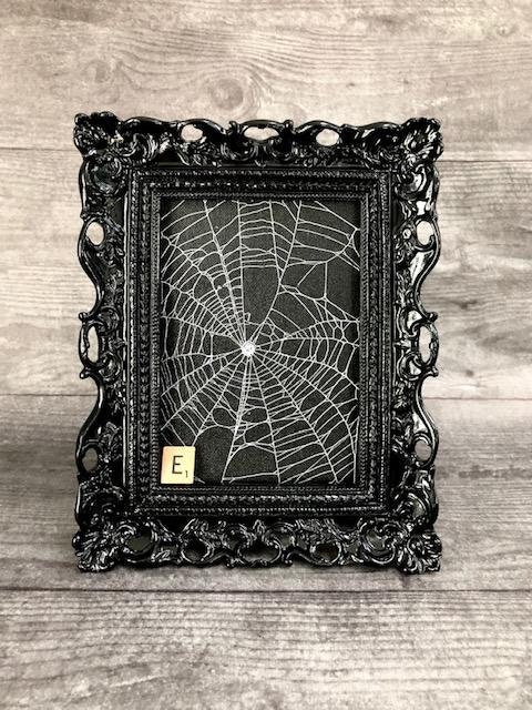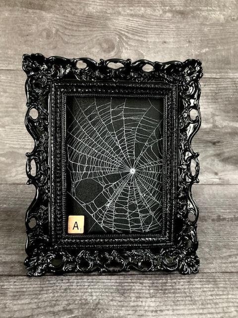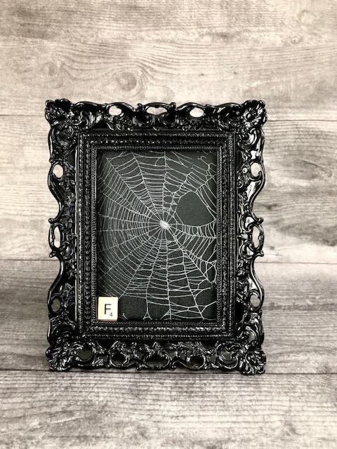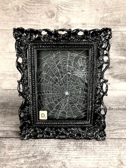This is a Real Spider Web, Preserved onto a black canvas board. It has been sealed and placed under glass in Black Ornate Victorian frames.