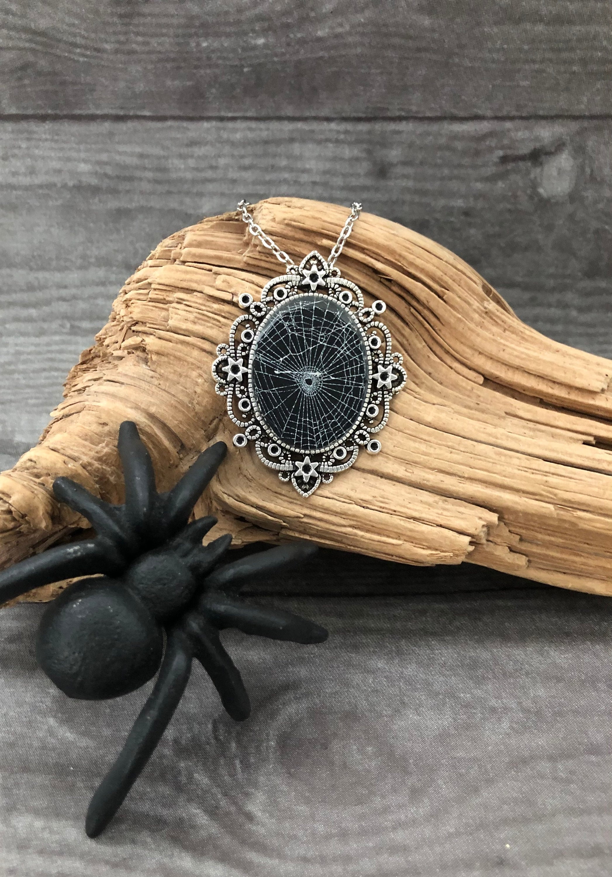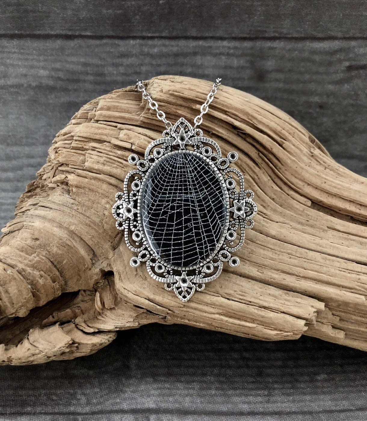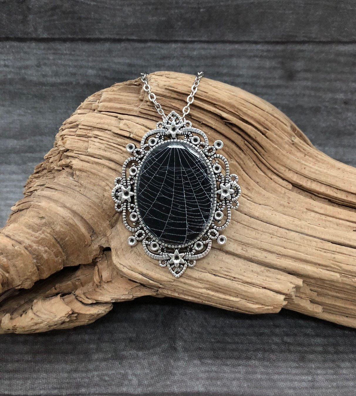 This is a REAL, Preserved spider web in resin on black paper. The web is sealed in a Beautiful Victorian Antique Silver tone oval pendant. Made from a strong metal alloy.